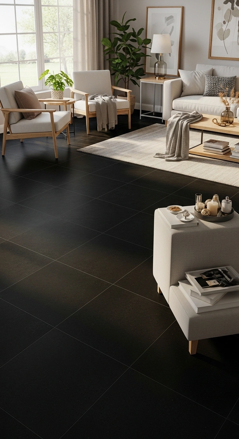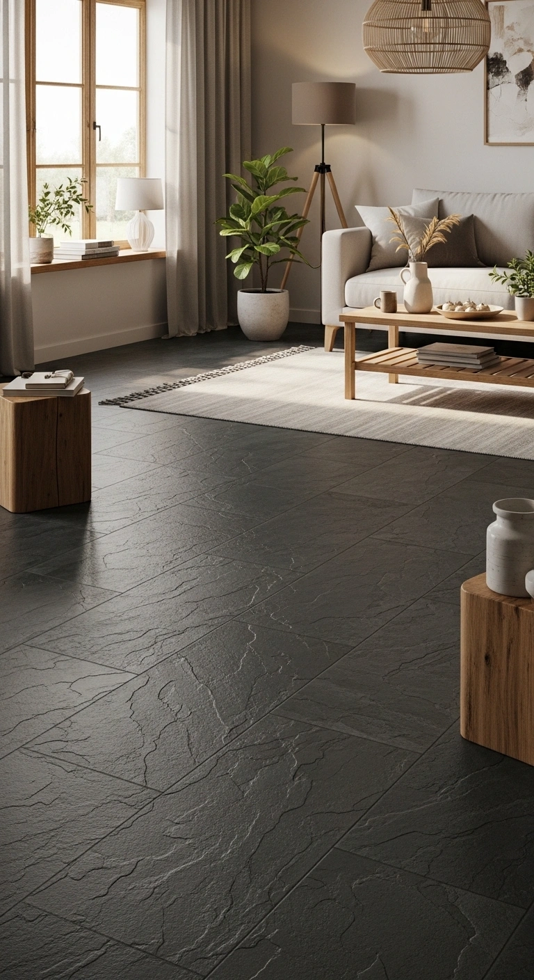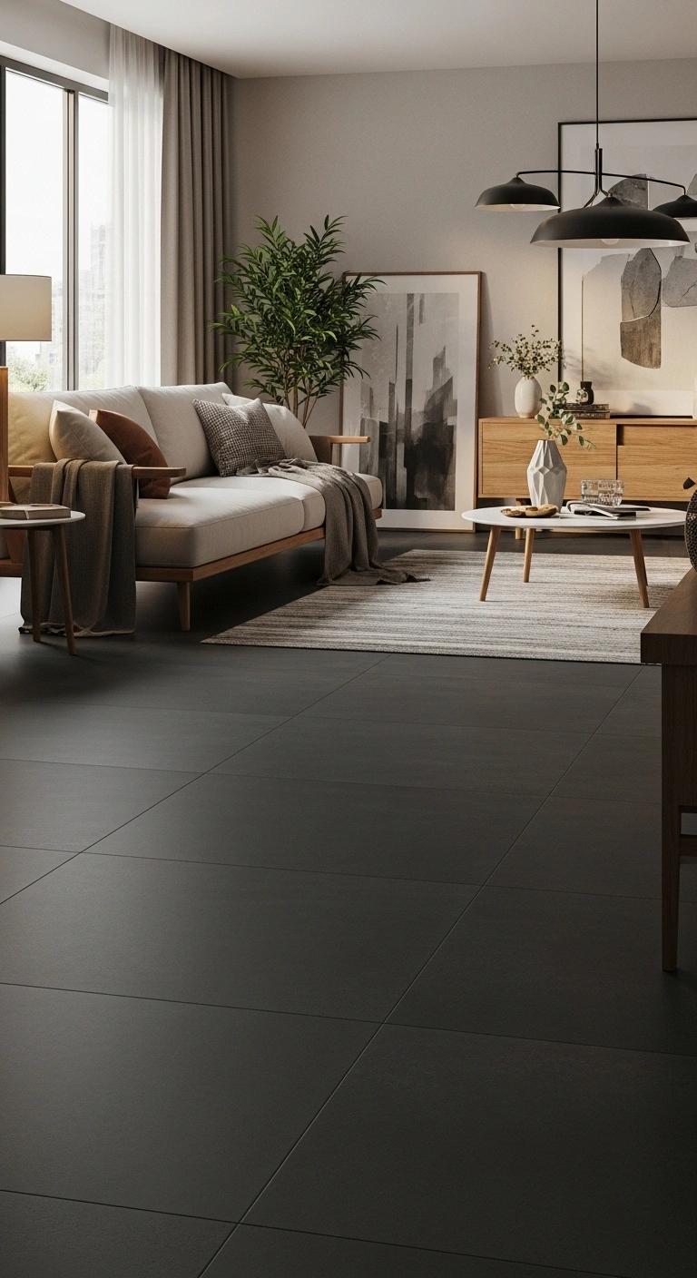 Charcoal gray tiles create a strong, modern base that adds instant depth to your living room. The darker tone anchors the space and makes lighter furniture stand out clearly. Choose large tiles with a soft matte finish to avoid too much shine and keep the look balanced.