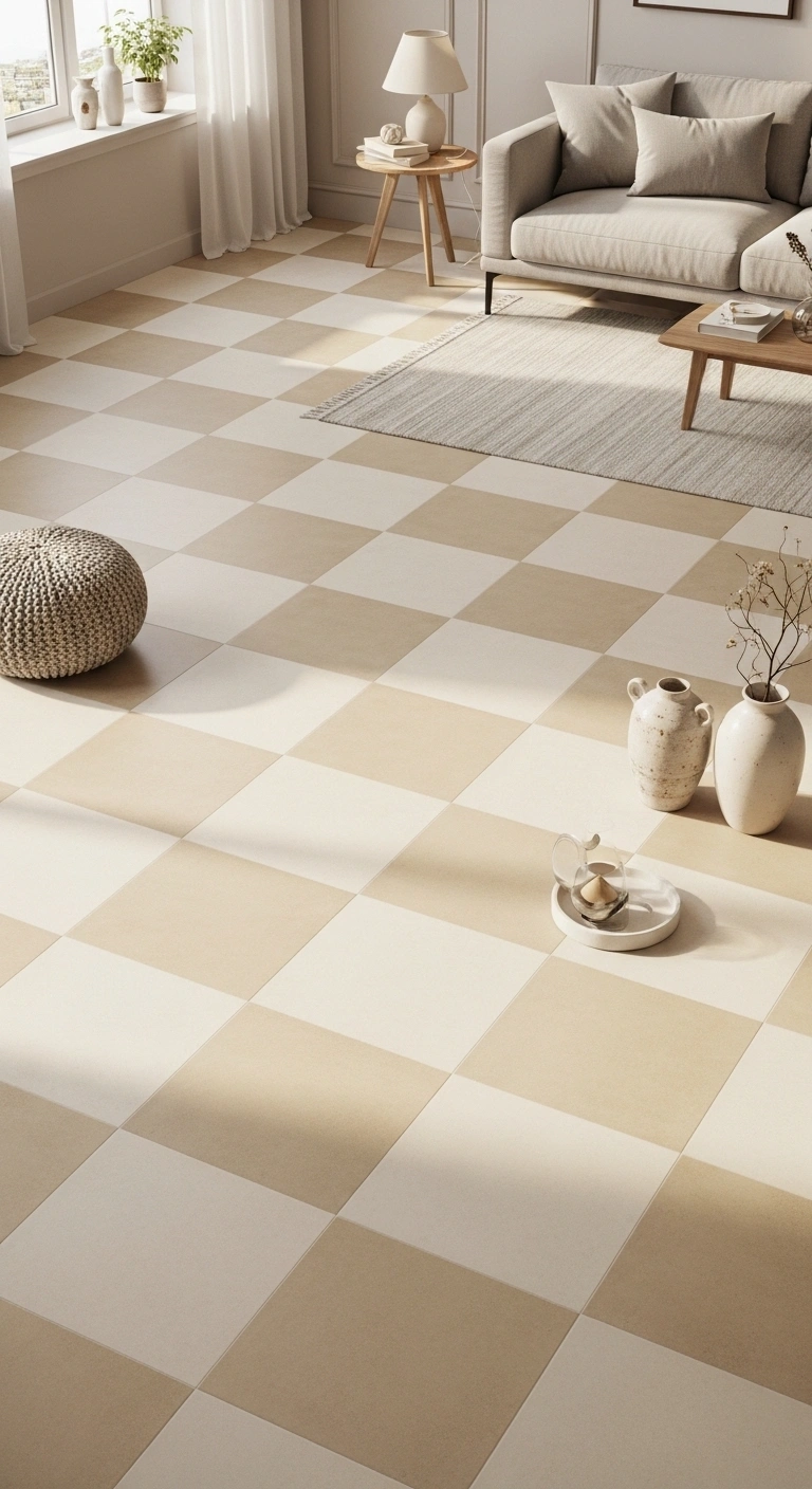 Checkerboard flooring adds a playful yet structured look to your living room. Instead of classic black and white, try softer combinations like beige and cream or light gray and white for a more subtle effect. This keeps the pattern interesting without making the space feel too busy.