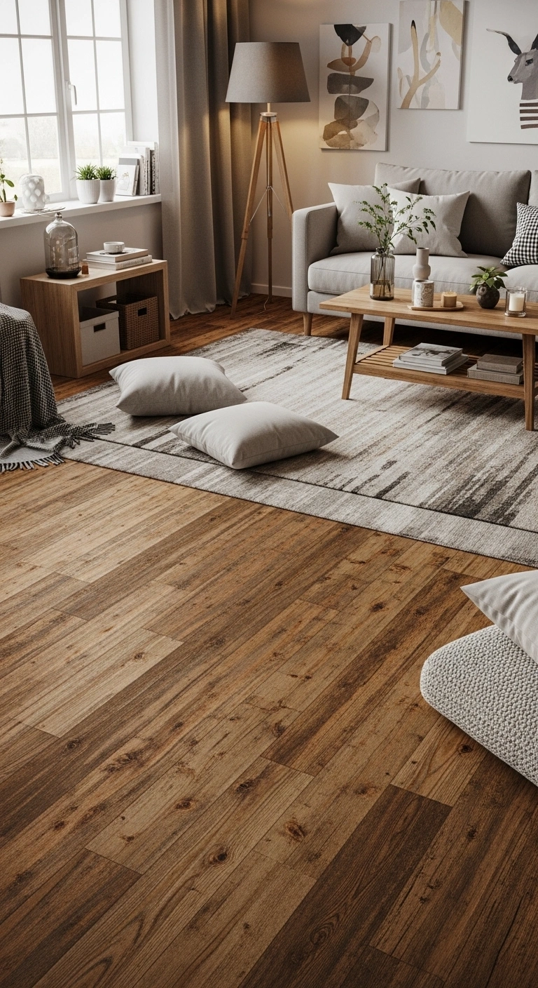 Use soft fabrics, layered rugs, and simple furniture to build a comfortable space. White or beige walls keep the room bright, while darker accents add contrast. This flooring choice is ideal if you want flexibility, allowing you to change your décor over time without needing to replace the floor.