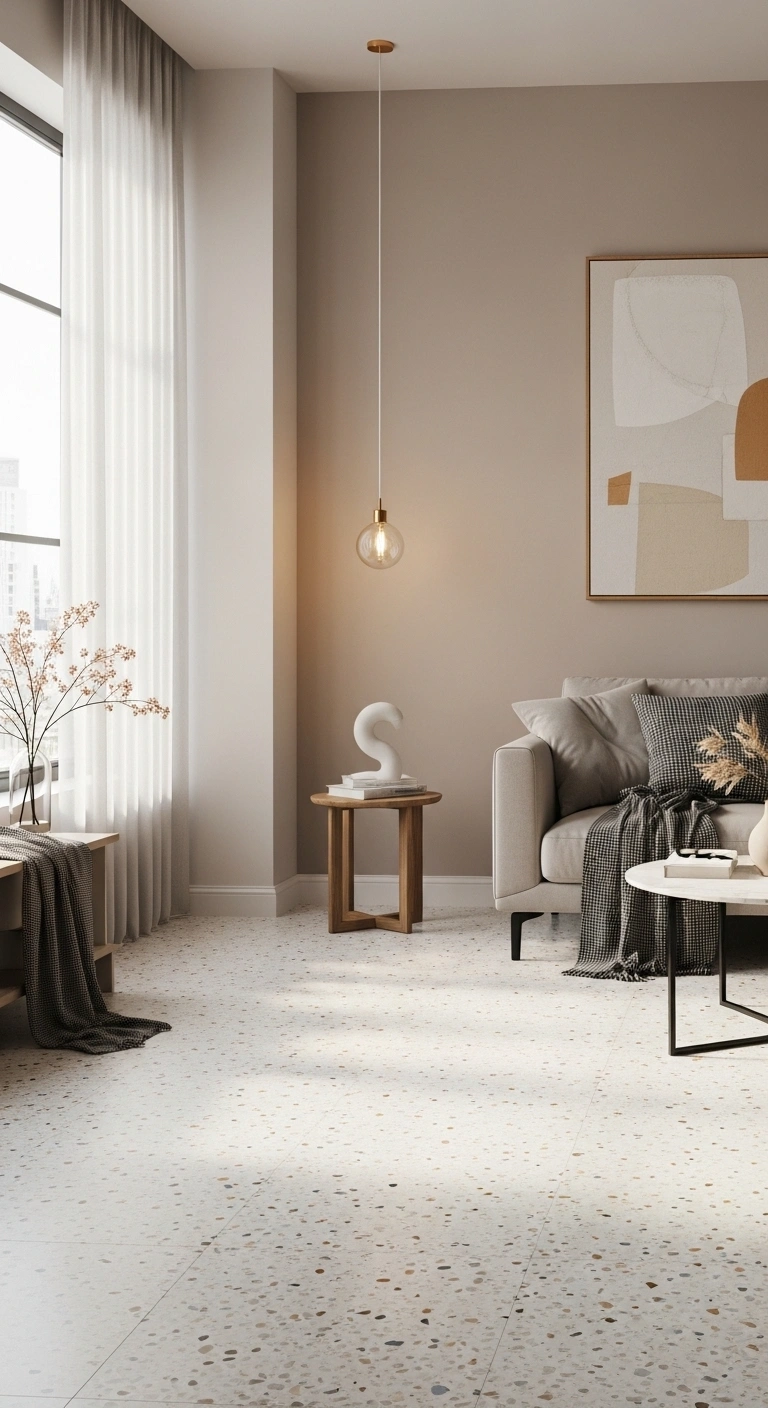 Keep the rest of the room simple so the flooring stands out naturally. Use neutral furniture and add small décor pieces that match the colors in the terrazzo. Soft lighting and minimal clutter help maintain a clean feel. This idea works especially well if you want something unique but still easy to style.