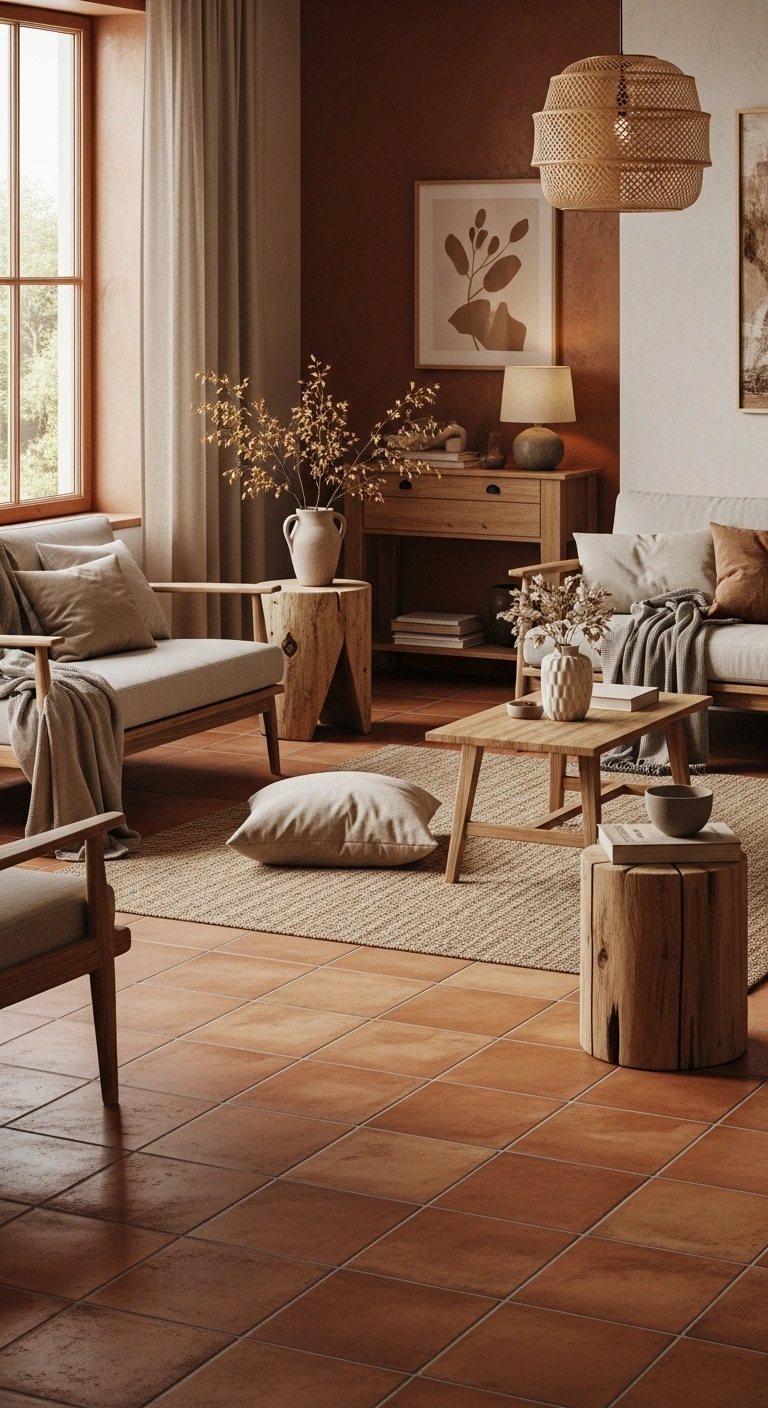 Terracotta tiles bring warmth and richness into your living room with their natural reddish tones. The earthy color creates a cozy and inviting atmosphere that feels grounded and timeless. Choose slightly textured tiles to enhance the natural feel.