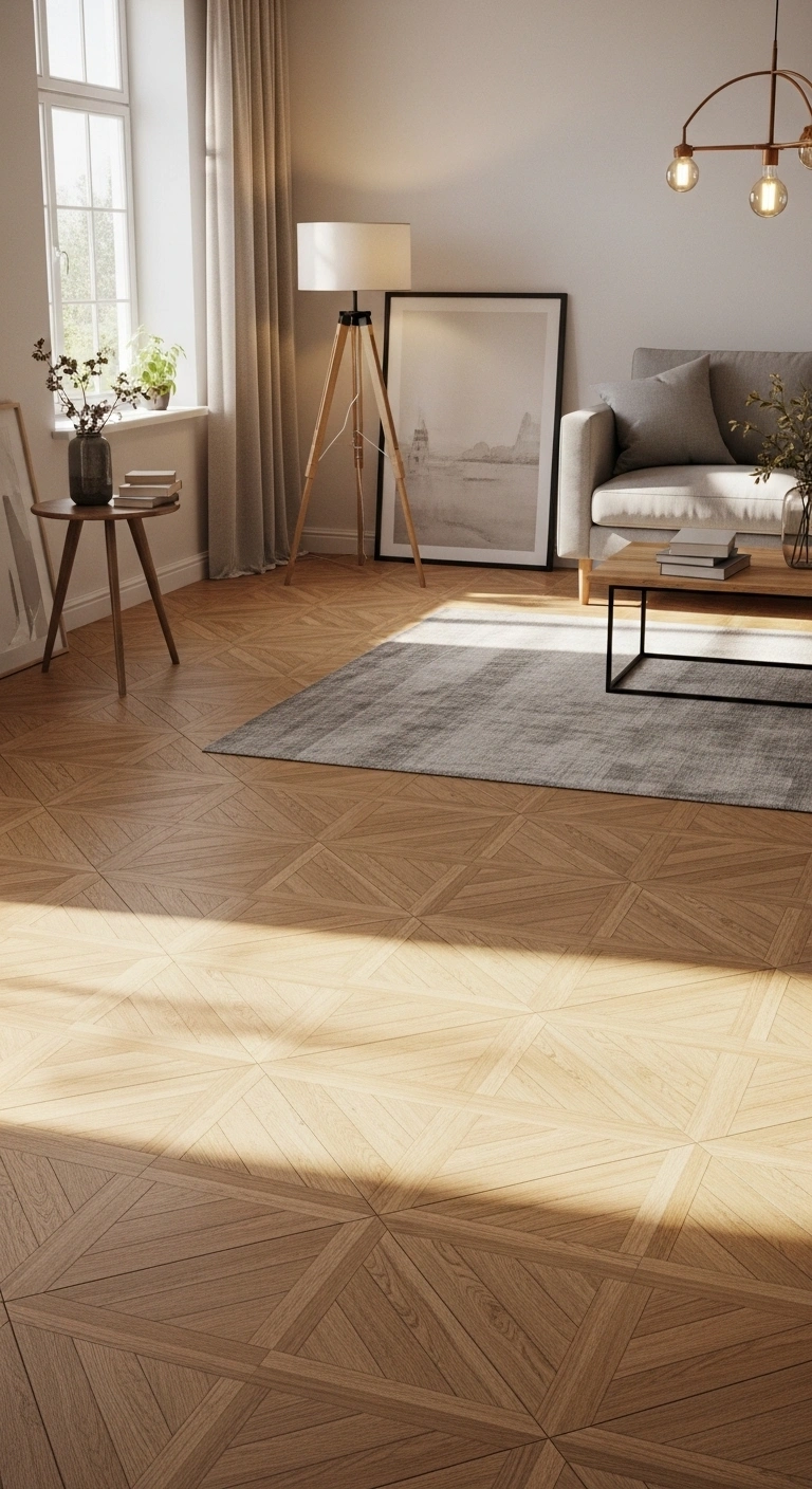 Keep your furniture simple and balanced so the pattern remains visible. Add a neutral rug if you want to soften the look while still showing parts of the design. Soft lighting and minimal décor help highlight the craftsmanship of the floor. This idea is perfect if you want a classic style with a bit more visual interest.