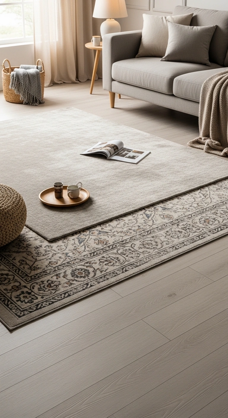 Layering rugs over a simple floor is an easy way to add texture and personality. Start with a neutral base like wood or tile, then place a larger soft rug underneath and a smaller patterned rug on top. This creates depth without changing your flooring completely.