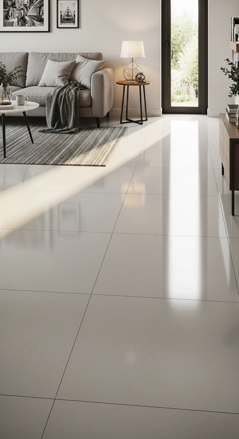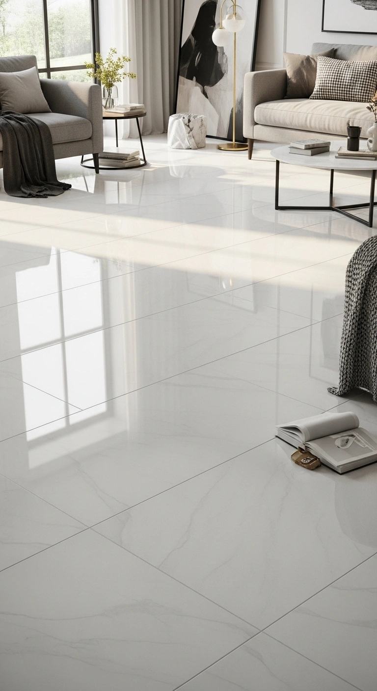 High gloss white tiles reflect light across your living room, creating a clean and open feel. The smooth surface enhances brightness, making the space look larger and more polished. This works especially well in rooms with limited natural light.