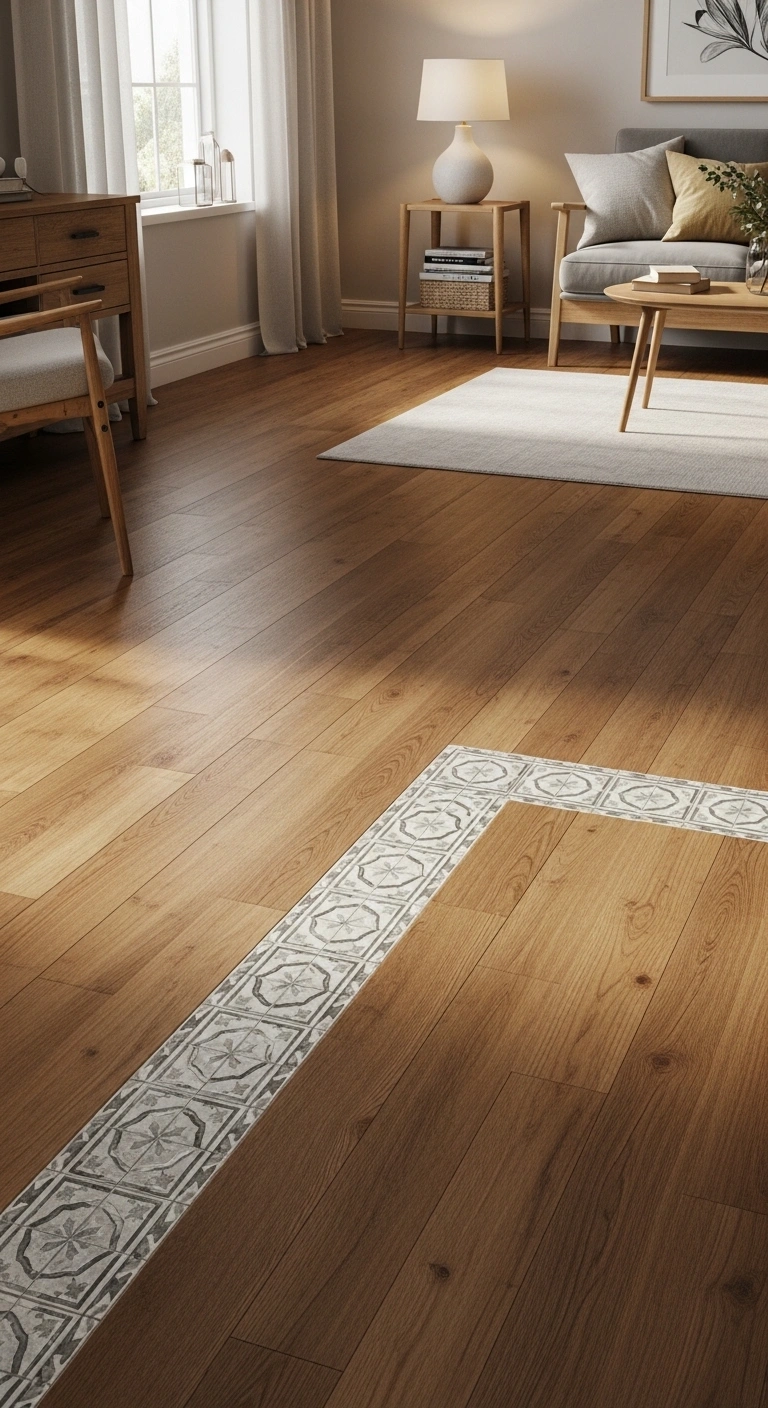 Combining wood and tile with border designs adds a custom, crafted look to your living room floor. You can use tiles to create a frame around a wood center or design small sections that highlight specific areas. This adds detail without overwhelming the space.