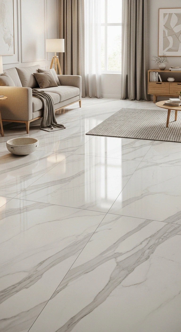 Large marble tiles can completely transform your living room into a bright, elegant space. Go for oversized tiles in soft white with subtle gray veining to keep the look clean and not overwhelming. Fewer grout lines make the room feel bigger and more open, which is perfect for modern homes.