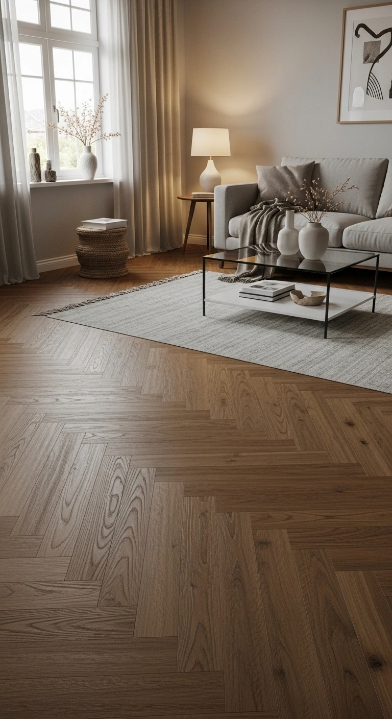 Herringbone flooring adds movement and personality without using bold colors. The zigzag pattern naturally draws the eye across the room, making even a small living area feel more dynamic. Choose medium-toned wood like walnut or smoked oak to highlight the pattern without making it too busy.
