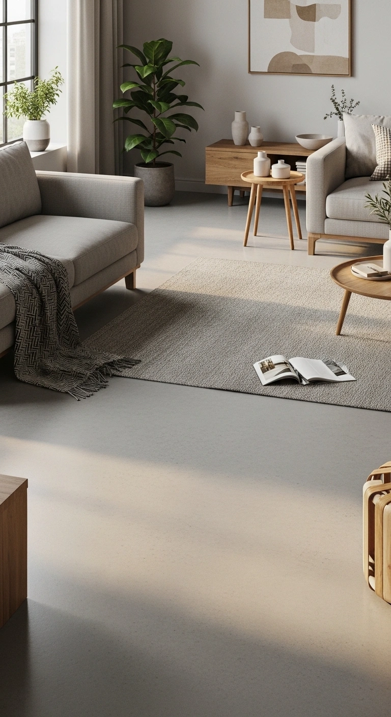 Polished concrete flooring gives your living room a modern, clean foundation that feels both minimal and bold. Its smooth, slightly reflective surface works beautifully with natural light, making the room feel airy and open. Choose a light gray or soft taupe finish to keep it from feeling too industrial.