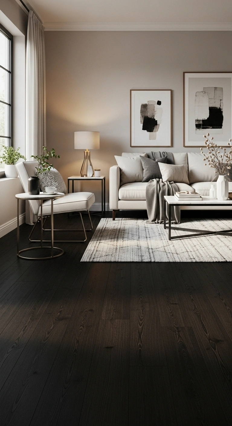 Use soft lighting, cream-colored furniture, and light rugs to create contrast. Wall colors like warm white or soft taupe help reflect light back into the room. Metallic accents like brass or gold also stand out beautifully against dark floors. This idea is perfect if you want a cozy yet sophisticated space that feels warm during evenings and elegant during the day.