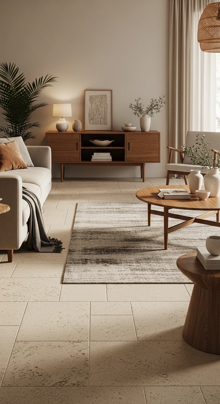 Natural stone flooring brings an organic and grounded feel to your living room. Materials like limestone, slate, or travertine add subtle texture and variation, making the floor feel alive and unique. Each tile has slight differences, which creates a natural, layered look.