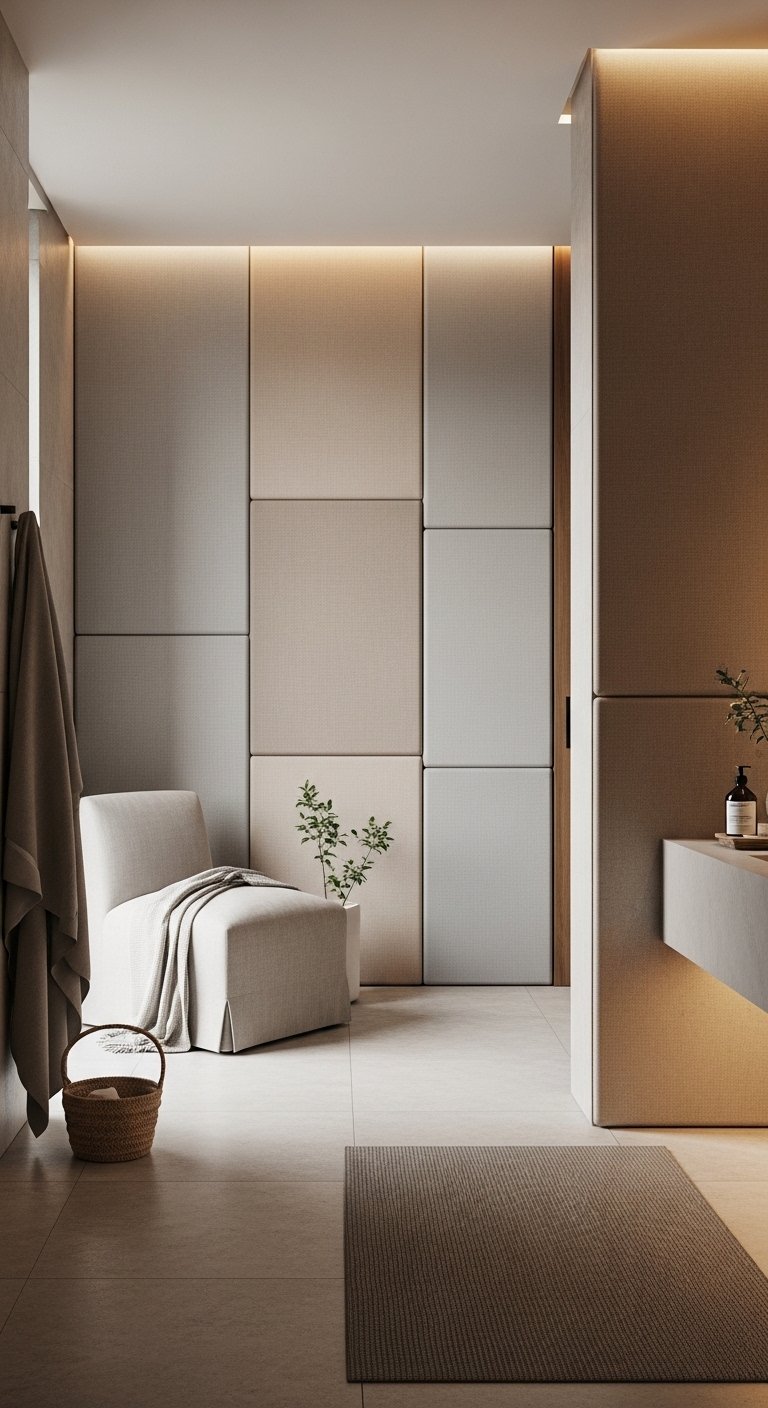 Soft fabric panels can transform a large bathroom by adding warmth and improving sound quality. Large spaces often feel echoey, so these panels help absorb noise and create a quieter environment. Choose moisture-resistant fabrics in neutral shades like beige, cream, or soft gray. Place them on one feature wall or near a seating area to soften the overall look. Combine them with natural materials like wood or stone for a balanced design. This idea makes the space feel more comfortable and inviting.