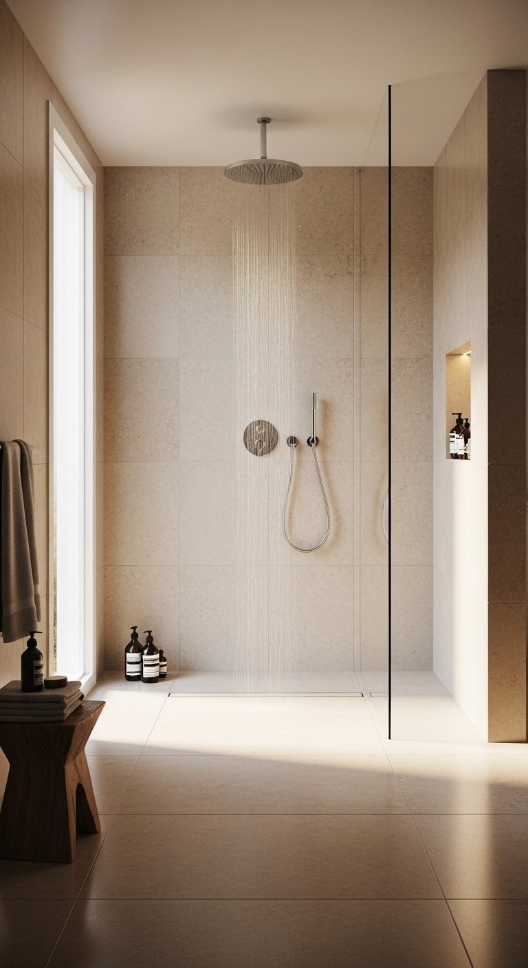 Enhance the experience by installing a wide rainfall showerhead directly from the ceiling for even water coverage. Add a glass divider only if needed, and keep it frameless to maintain openness. Use subtle lighting above to highlight the water flow without making the space feel harsh. Keep accessories minimal so the focus stays on the clean design and relaxing function. This idea feels effortless yet highly luxurious. It creates a spa-like experience that feels both modern and easy to maintain.