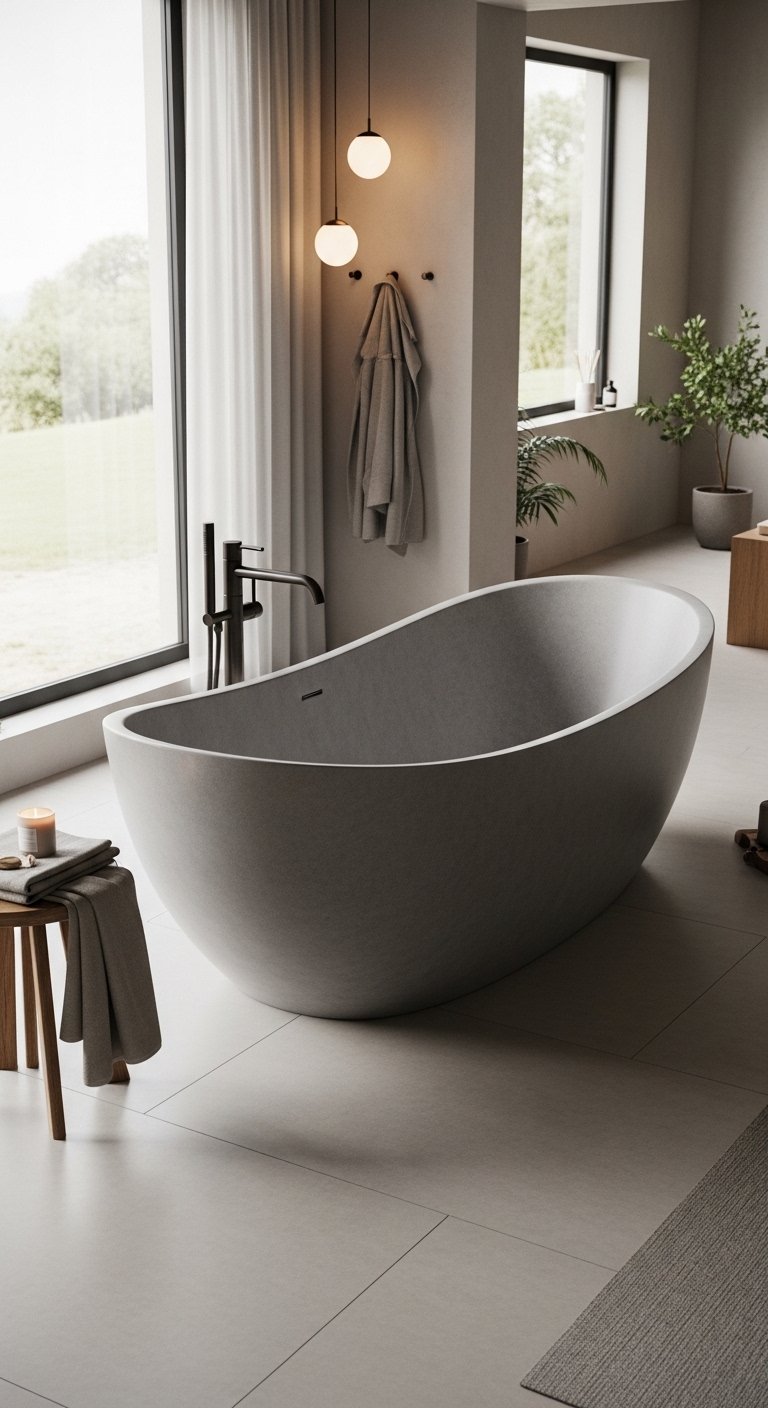 To support the design, use simple floor textures and soft lighting that highlight the shape of the tub. Add a small side table or stool in wood or stone to keep essentials nearby. Avoid heavy decorations that compete with the sculptural form. This approach works well in large bathrooms where scale allows bold pieces to shine. It brings a gallery-like feel into your home while still keeping comfort in mind. The result feels elegant, artistic, and carefully designed.