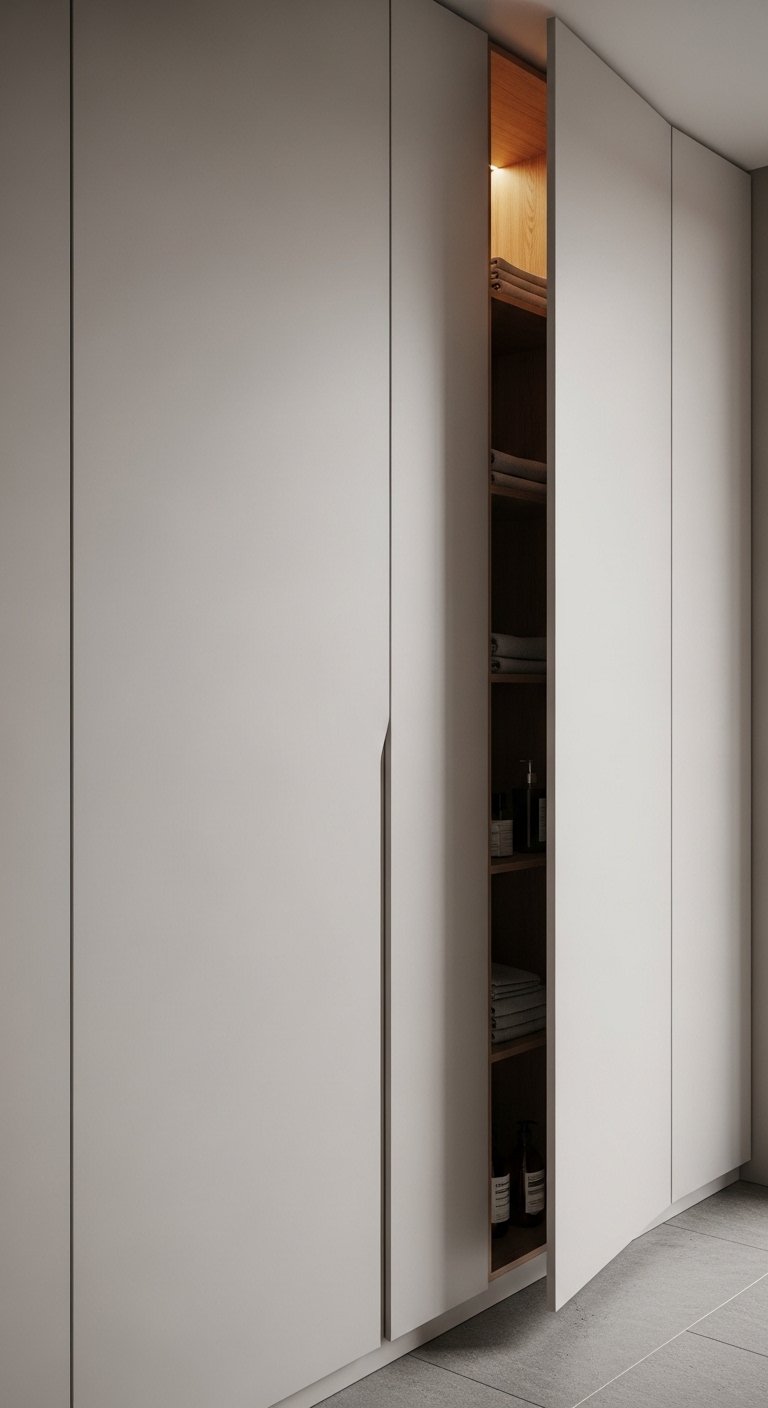 Inside the panels, organize items neatly using baskets, trays, or built-in compartments. Keep frequently used items within easy reach while storing extras out of sight. This setup improves both function and visual balance without adding bulky furniture. It also allows you to keep surfaces clear and minimal. This idea feels modern and highly practical at the same time. The result is a bathroom that looks calm, spacious, and effortlessly organized.