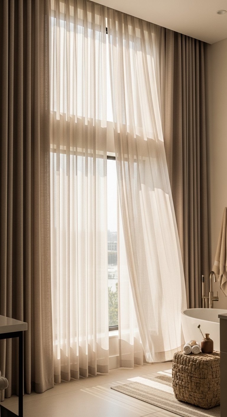 Layered curtains add softness and gentle movement to a large bathroom while also providing privacy. Use sheer inner curtains to allow natural light to pass through and thicker outer layers for coverage when needed. Choose light fabrics in neutral tones like cream, soft gray, or warm white to maintain a calm look. Let the curtains fall from ceiling to floor to enhance the height of the space. This idea works especially well near large windows or glass walls. It brings a relaxed and cozy feeling into the room.