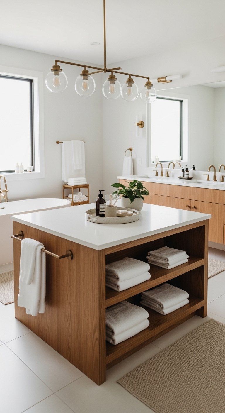 Style the island with neatly folded towels, trays, or a small plant to keep it visually appealing. Avoid overloading the surface so it remains clean and organized. This setup works well in bathrooms with enough walking space around the island. It creates a functional center point that feels both practical and stylish. The result feels structured, spacious, and thoughtfully designed. It turns unused space into something useful and visually pleasing.