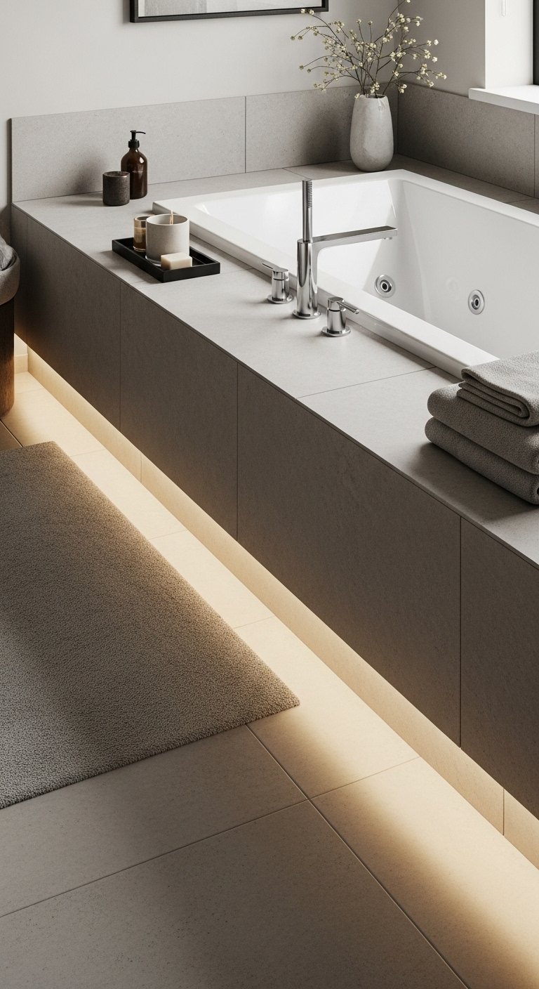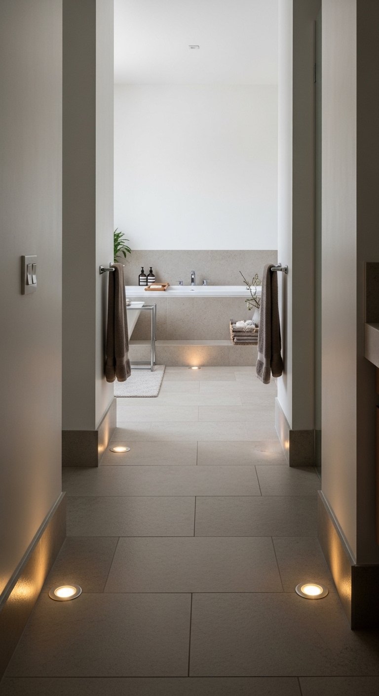 Pair the floor lighting with neutral flooring materials that reflect the glow gently. Avoid overly bright or cool-toned lights that can feel harsh. This setup creates a quiet and peaceful atmosphere that feels similar to a high-end spa. It also makes nighttime use more comfortable without needing strong overhead lighting. This idea is easy to implement but has a strong visual impact. The result feels smooth, calming, and well-designed.
