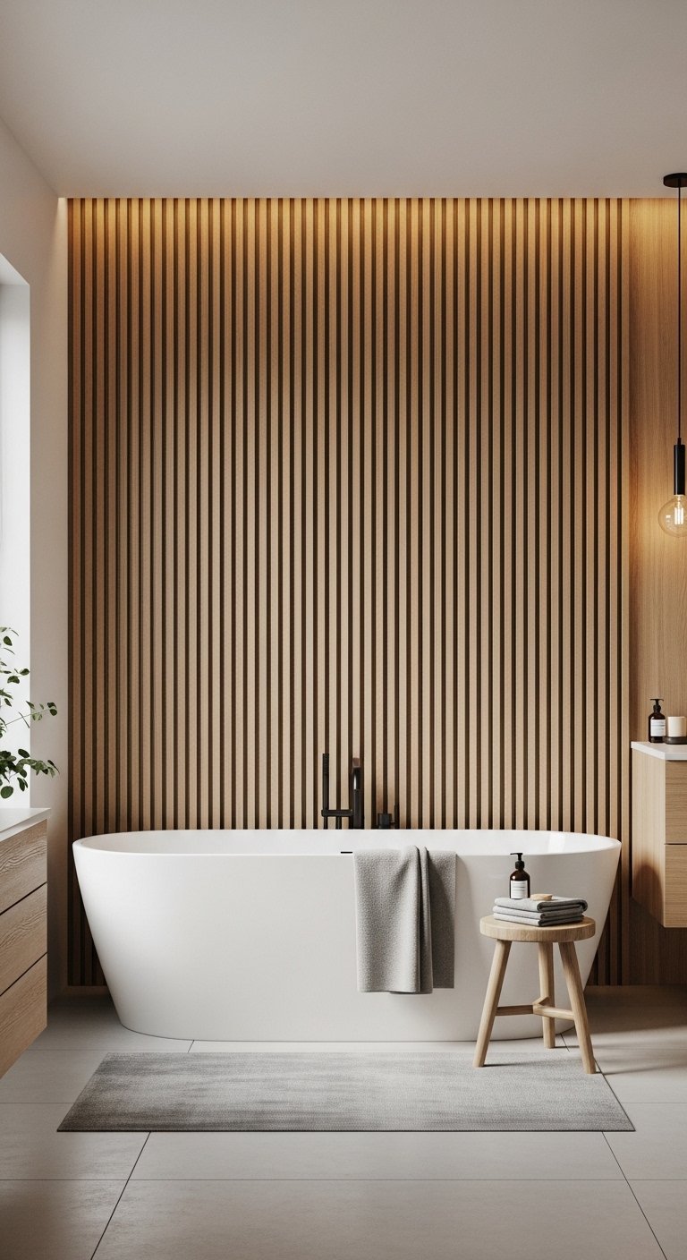 To enhance the effect, pair the wood slats with soft lighting that highlights their texture. Keep the rest of the walls simple so the feature stands out naturally. Avoid adding too many decorations on this wall to maintain a clean look. This approach balances natural warmth with modern simplicity. It makes the bathroom feel more inviting without losing its spacious quality. The result feels calm, textured, and visually interesting.
