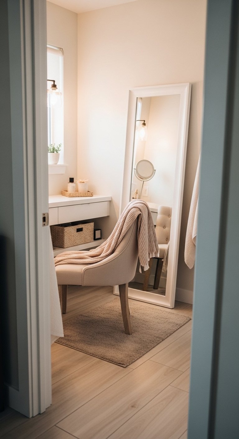 A private dressing nook turns your large bathroom into a more complete and functional space. Use a corner or section of the room to add a comfortable chair, a small mirror, and simple storage for clothing or accessories. Choose soft fabrics and neutral tones to keep the area calm and cohesive. Add a small rug to define the space and make it feel separate from the rest of the bathroom. This idea adds convenience without requiring a separate room.