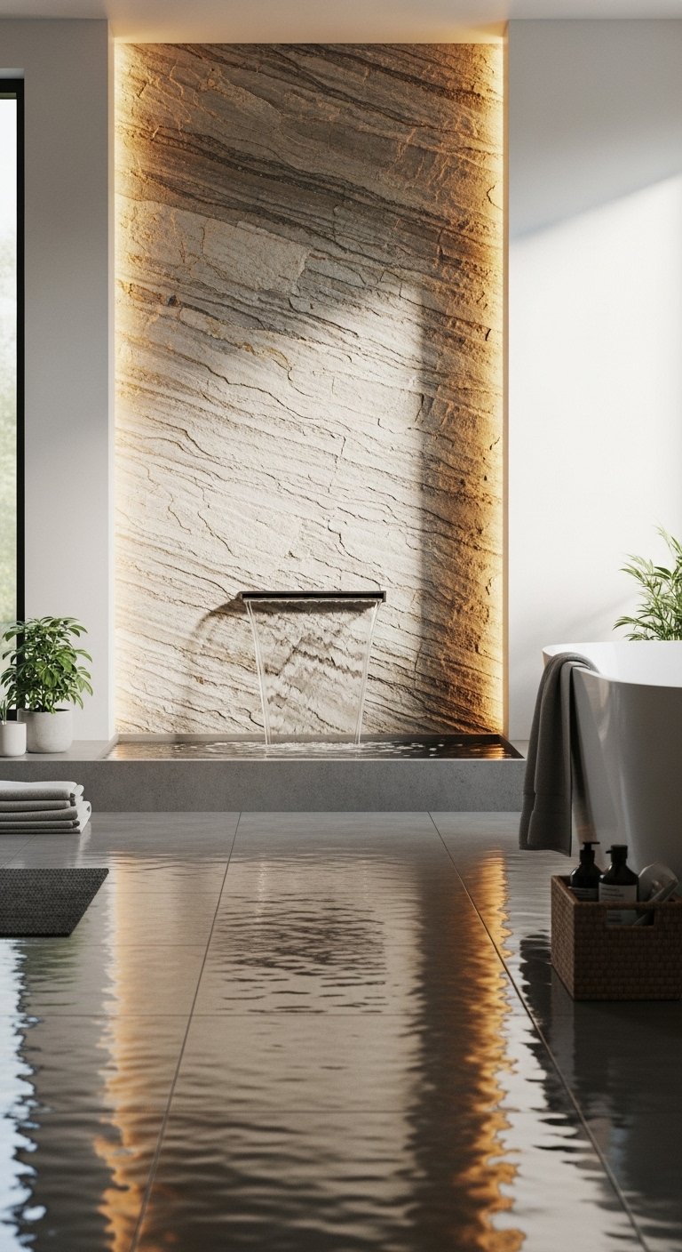 Enhance the effect by using soft lighting to highlight the flowing water without making it too bright. Keep the surrounding area minimal so the feature remains relaxing rather than distracting. Make sure the water flow is gentle and consistent to avoid noise that feels harsh. Pair it with natural materials like wood or plants to strengthen the spa-like feel. This setup creates a soothing atmosphere that supports relaxation. The result feels peaceful, balanced, and quietly luxurious.