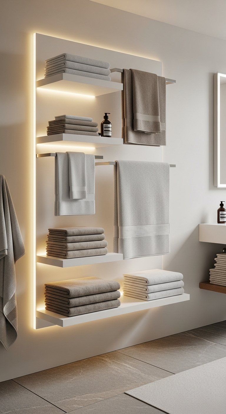 23. Add a Floating Towel Wall With Warm Backlighting