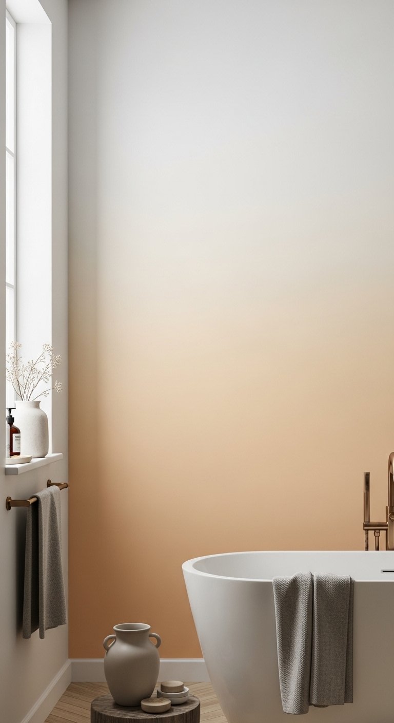 Pair the gradient walls with simple fixtures and minimal decor to keep the focus on the soft transitions. Use warm lighting to enhance the blending of colors and create a calm atmosphere. Avoid strong contrasts that can break the peaceful effect. This setup helps unify the entire bathroom while adding a unique design element. It feels modern yet soothing at the same time. The result is a space that looks soft, balanced, and visually relaxing.
