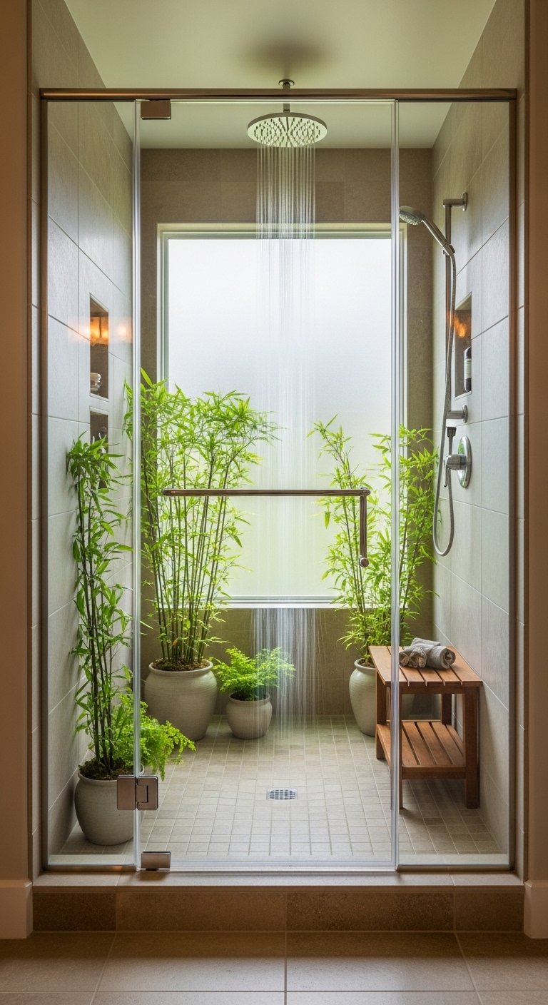 Enhance the experience by installing a rainfall showerhead from the ceiling to create a gentle and even water flow. Add a small wooden bench or stool inside the shower for both comfort and style. Keep accessories minimal so the plants and textures remain the main focus of the space. Make sure there is proper ventilation to keep the area fresh and prevent excess moisture buildup. This idea works well for large bathrooms because it uses space creatively without adding visual heaviness. The result feels calming, refreshing, and naturally luxurious.