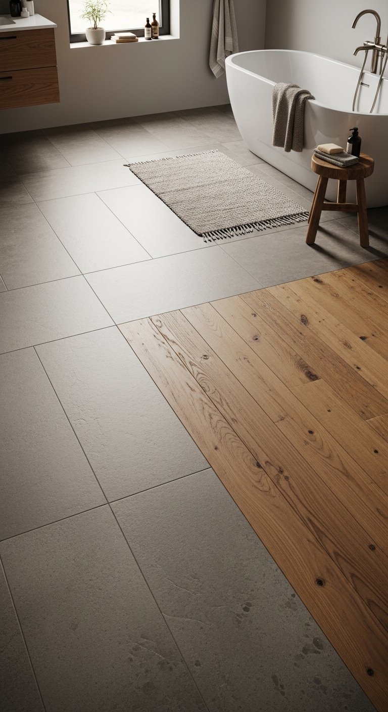 To make the transitions feel even smoother, align the materials in a way that guides movement naturally across the room. Avoid using too many contrasting tones so the space stays calm and balanced. You can also use subtle patterns in the flooring to add depth without overwhelming the design. This idea works especially well in large bathrooms where empty space can feel unstructured. By layering textures, you create a flow that feels both organized and relaxing. The final result feels thoughtful and visually connected.