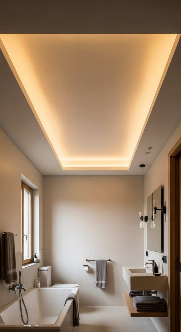 A ceiling feature can completely change how a large bathroom feels by adding depth and warmth from above. Create a recessed or layered ceiling design that frames the space without making it feel heavy. Use hidden cove lighting along the edges to produce a soft glow that spreads evenly across the room. Choose warm white lighting to keep the environment calm and inviting. Keep the ceiling color neutral so the lighting becomes the main highlight. This idea adds dimension without introducing clutter or extra decor.