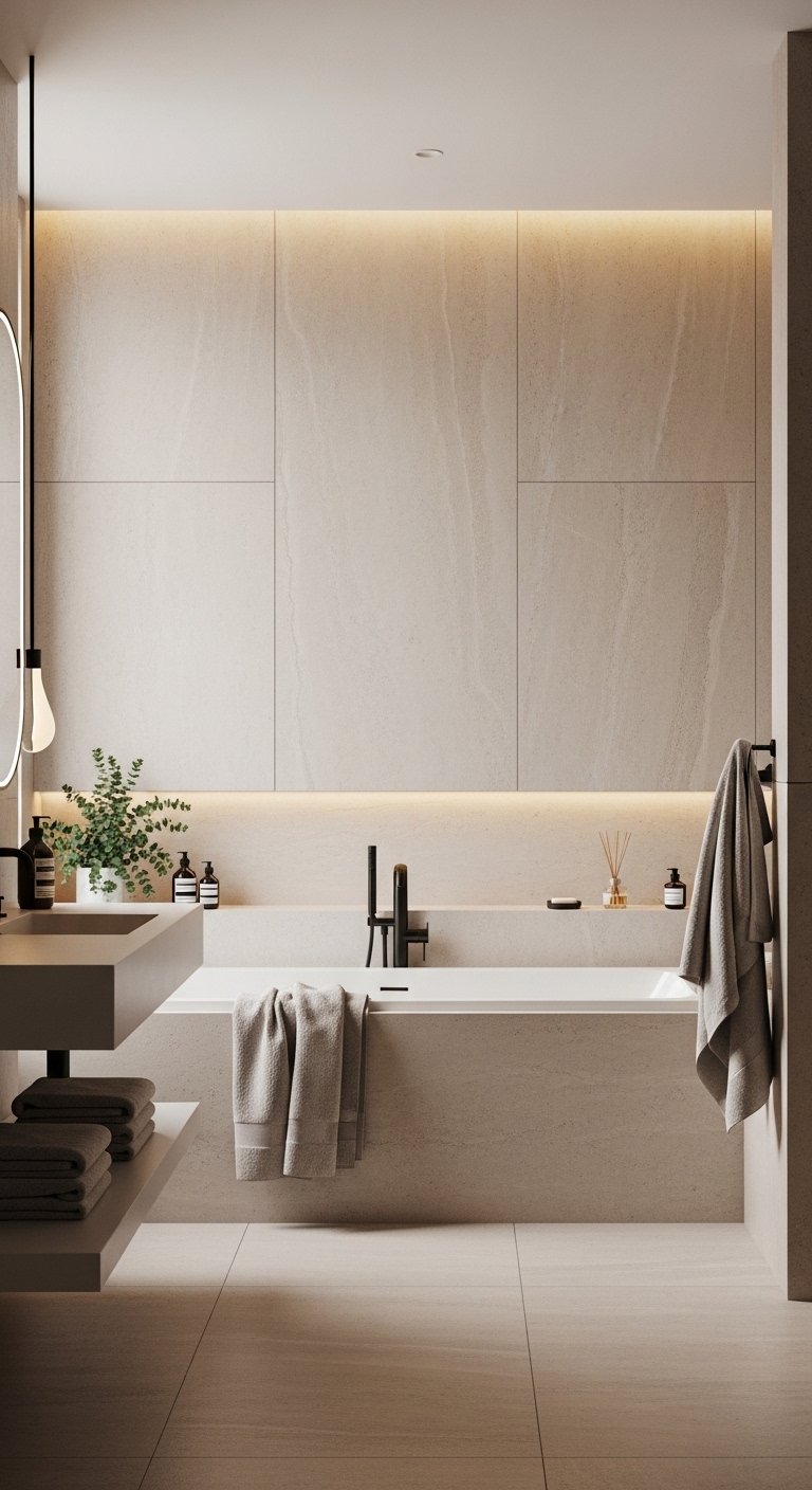 Oversized wall panels create a smooth and seamless look that makes a large bathroom feel even more open and refined. Choose materials like marble, porcelain, or textured stone with soft patterns that do not overwhelm the space. Large panels reduce the number of grout lines, which helps the walls look cleaner and more continuous. Stick to neutral shades like soft gray, beige, or white to maintain a calm and balanced feel. This approach works especially well in spacious bathrooms where scale matters. It highlights the size of the room without making it feel busy.
