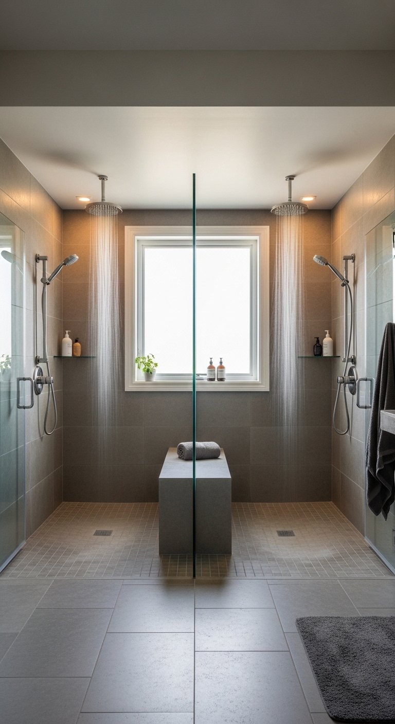 A dual shower setup introduces a unique and functional layout that works perfectly in large bathrooms. Design two shower areas side by side or facing each other to create a balanced and spacious arrangement. Use matching fixtures and finishes to keep the design symmetrical and visually pleasing. Add a central walkway or a shared bench between the two zones for convenience. Stick to neutral tones and clear glass panels to maintain an open feel. This layout allows two people to use the space comfortably without feeling crowded.