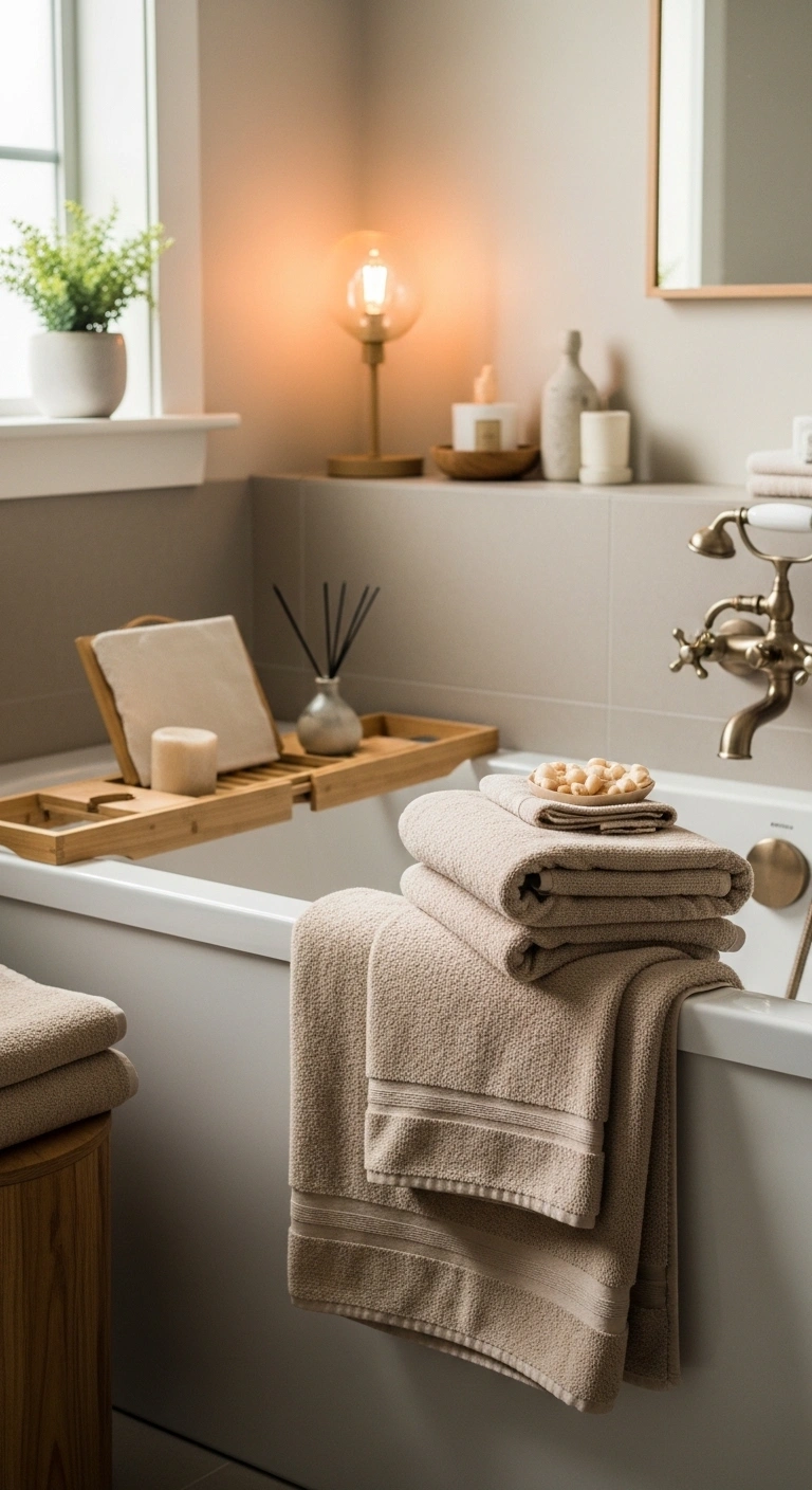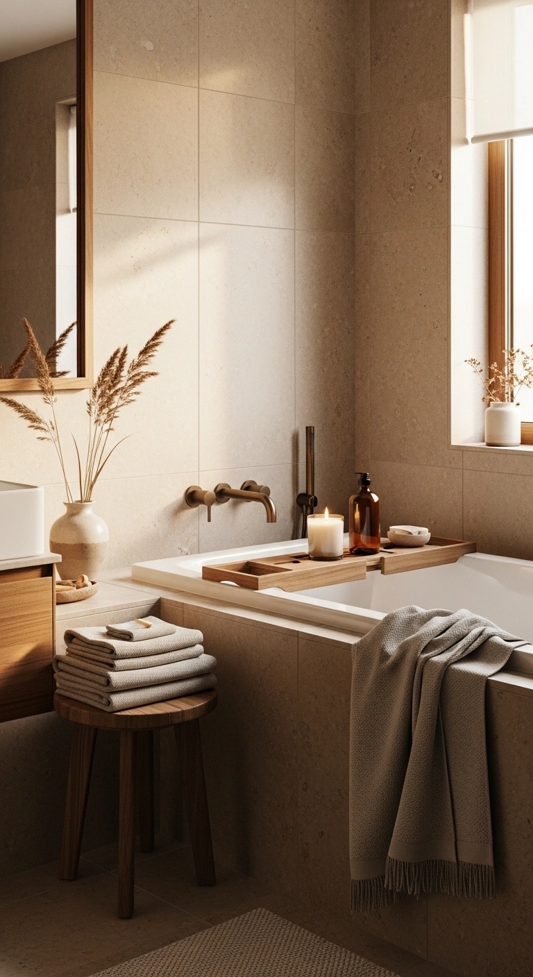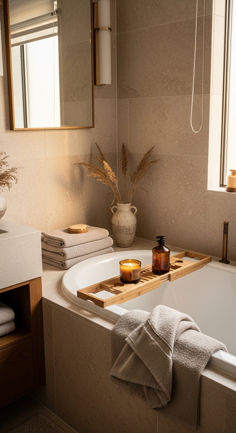 Transform your bathroom into a cozy fall retreat by focusing on comfort and relaxation. Use warm lighting, soft towels, and calming scents like vanilla or sandalwood. Keep your color palette neutral with touches of autumn tones for warmth. Add small details like a wooden tray by the bathtub or a neatly arranged shelf with essentials. The goal is to create a space where you can relax and unwind. Keep everything clean, simple, and thoughtfully arranged. This final idea ties all your fall bathroom decor ideas together into one cohesive and inviting space.