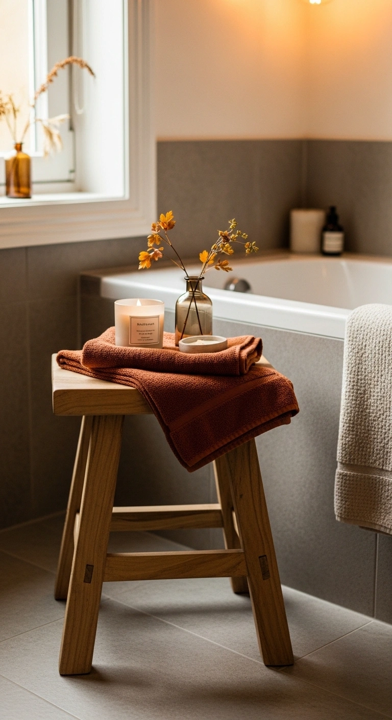 A small wooden stool can turn into a cozy fall decor moment in your bathroom. Place it near the bathtub or in a corner and style it with simple autumn accents. Add a folded towel in a warm tone, a candle, and a small vase with dried stems. The natural wood adds warmth and texture, making the space feel grounded and relaxed. Choose a stool with a slightly worn or matte finish for a more organic look. Keep the styling minimal so it doesn’t feel crowded. This idea works well in both small and large bathrooms because it adds character without taking up too much space. It also doubles as a functional surface when needed.