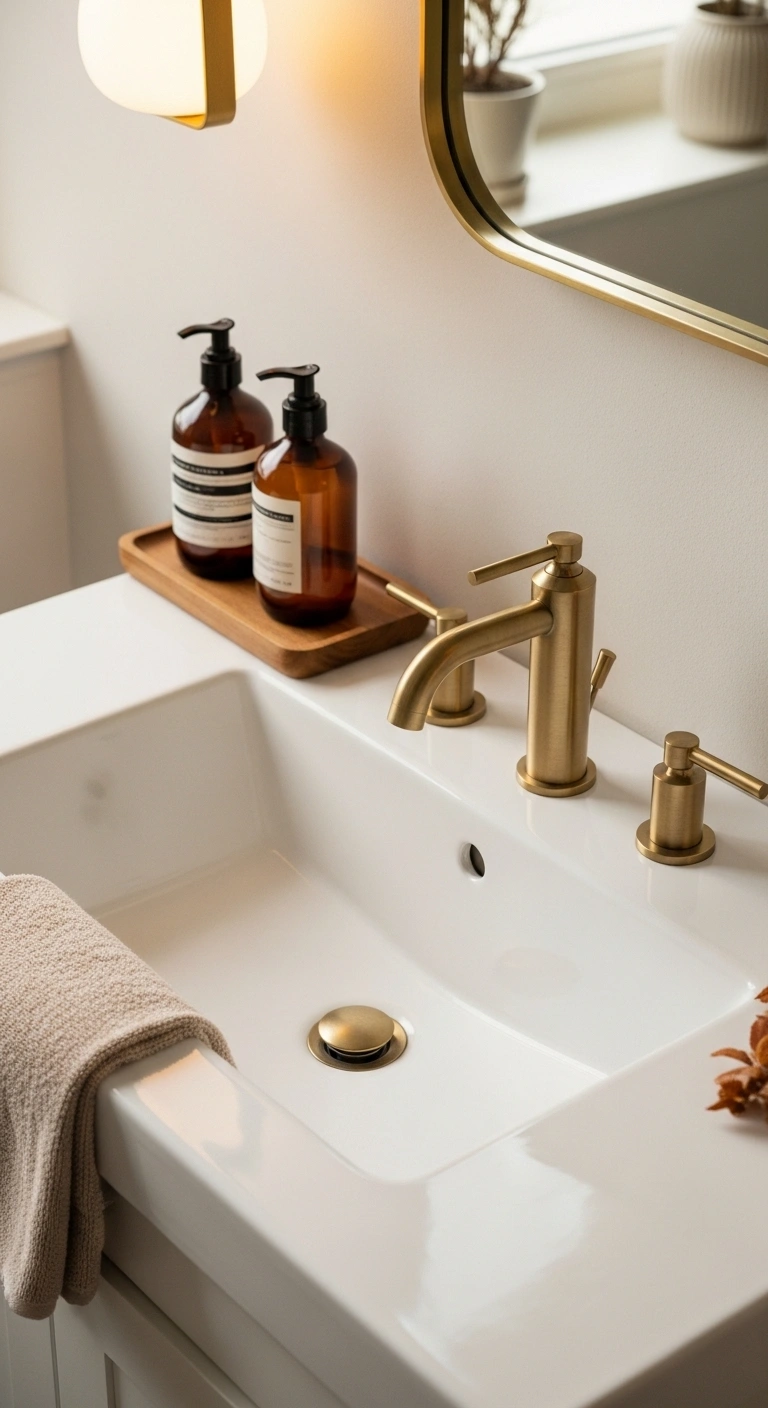 Warm metallics like brushed gold, copper, or bronze can instantly elevate your fall bathroom decor. Swap out small details like soap dispensers, toothbrush holders, or trays with metallic finishes. These tones reflect light beautifully and add a subtle glow to the space. Pair metallics with soft neutral colors to keep the look balanced and not too shiny. Even small changes like adding a gold-framed mirror or copper hooks can make a big difference. The key is to use metallics in a simple and intentional way. This adds warmth and a hint of luxury without overwhelming your bathroom design.
