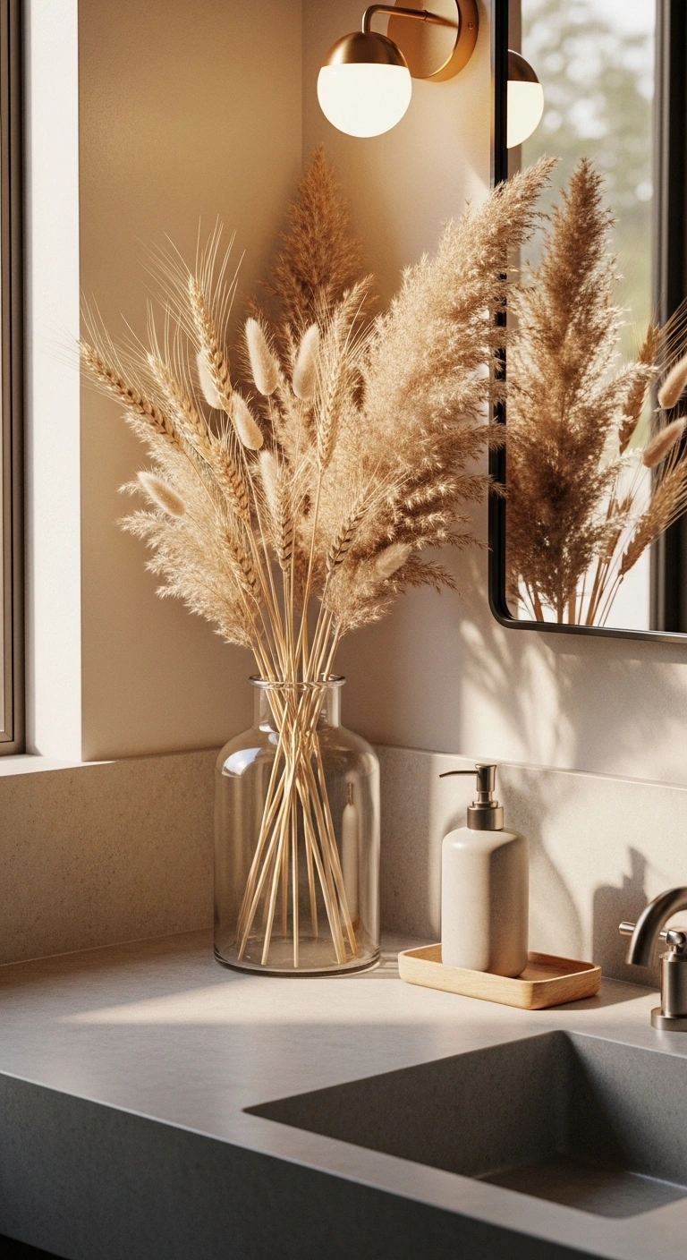 Dried flowers are perfect for fall because they add texture and warmth without needing maintenance. Use stems like pampas grass, dried eucalyptus, or wheat in a simple vase. Choose neutral or muted tones that blend with your bathroom colors. Place them on your counter, shelf, or even near the bathtub for a soft decorative touch. These natural elements add movement and make the space feel calm and organic. You can also mix different dried stems for a fuller look. This idea works well in both modern and rustic bathrooms, making it a versatile choice.