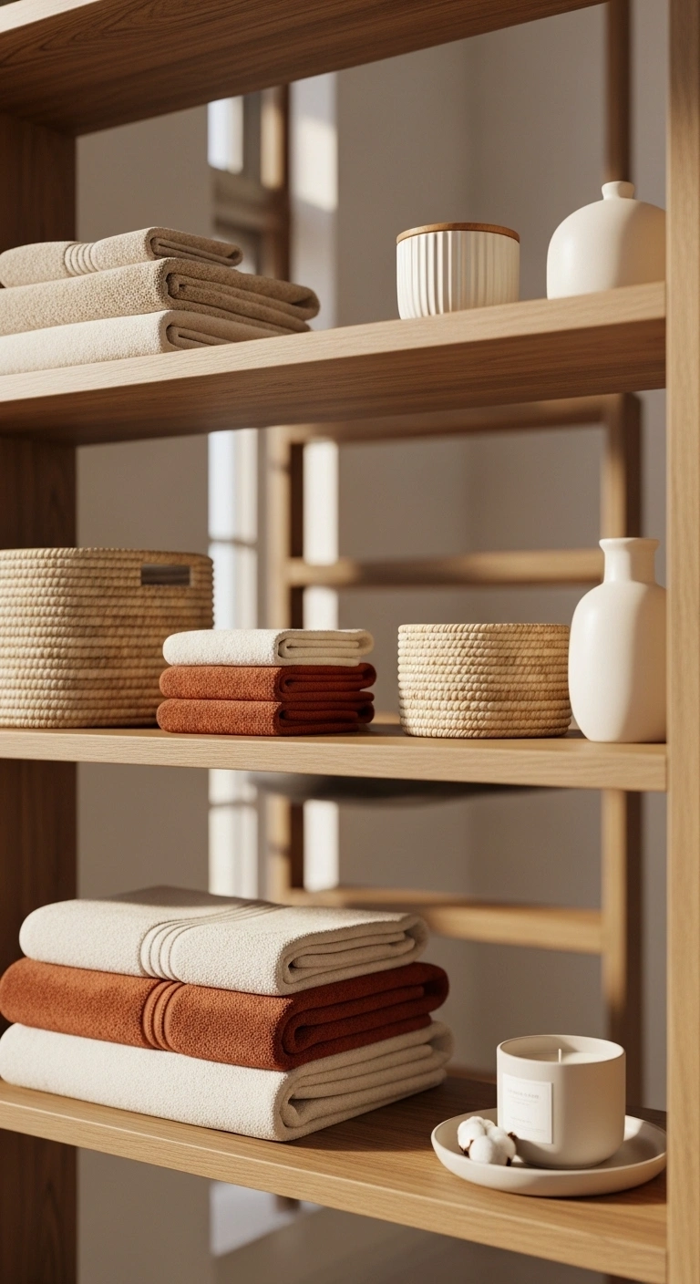Start by layering your bathroom with soft, earthy textiles that instantly change the mood for fall. Think warm beige towels, deep rust hand cloths, and a cozy bath mat in muted brown or terracotta. These tones feel calm and grounded, perfect for cooler days. Choose fabrics like cotton or waffle weave that add subtle texture without feeling heavy. You can fold towels neatly on open shelves or roll them into baskets for a relaxed look. Try pairing light neutrals with one deeper autumn shade to create balance instead of making the space too dark. Even a simple fabric shower curtain in a warm tone can shift the entire vibe. Focus on softness and comfort so the space feels inviting every time you step in.