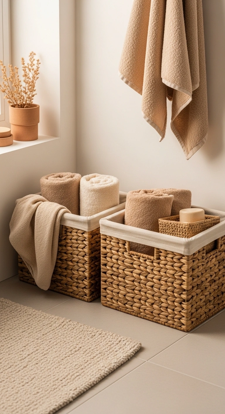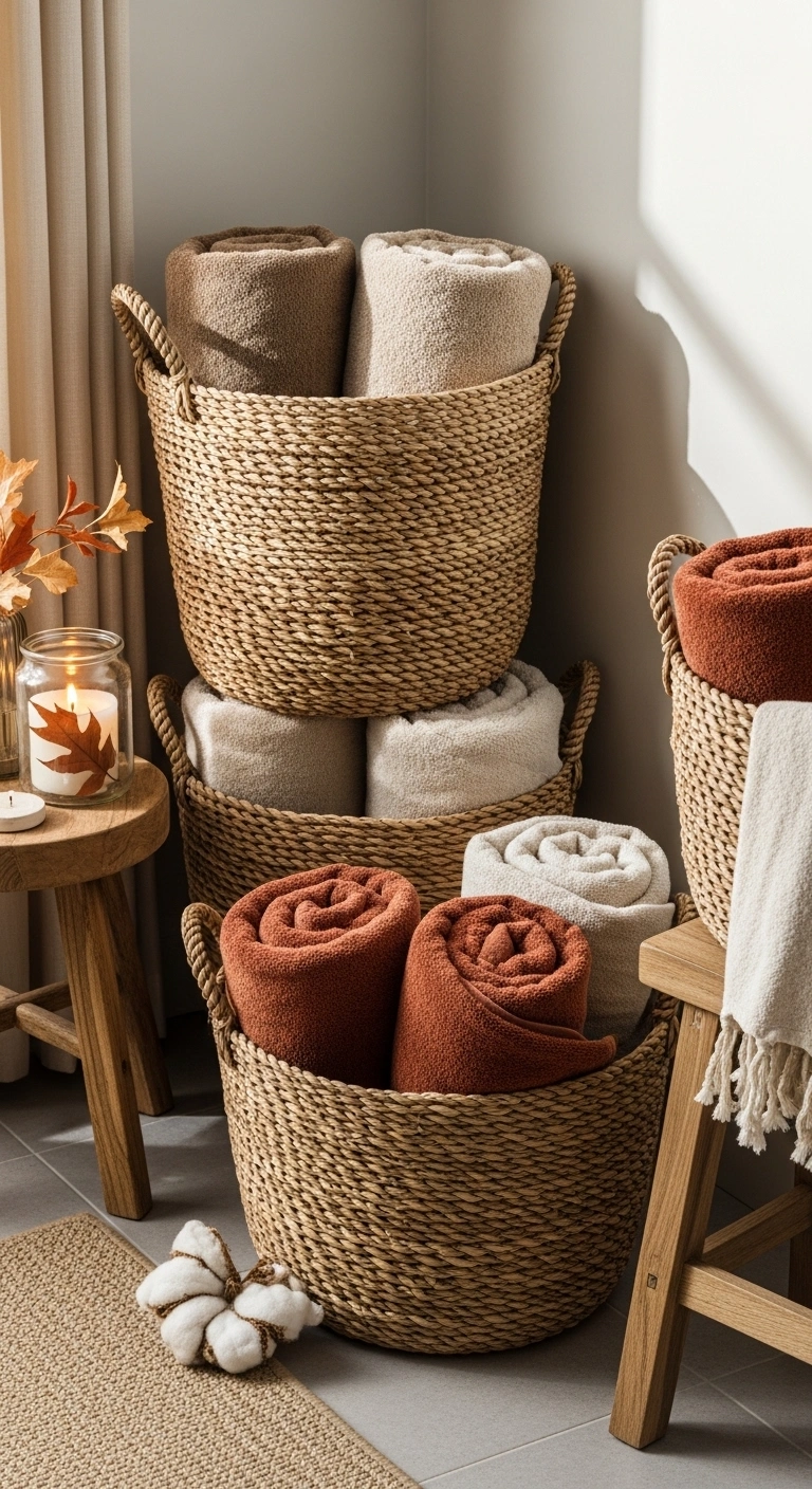 Woven baskets are both practical and decorative, making them perfect for fall bathrooms. Choose baskets in warm natural tones like tan, brown, or honey. Use them to store towels, toiletries, or even extra toilet paper. Place them on the floor, under the sink, or on shelves for easy access. The woven texture adds warmth and a cozy, lived-in feel. You can also line baskets with soft fabric to make them look even more inviting. This is a simple way to keep your bathroom organized while adding seasonal charm.
