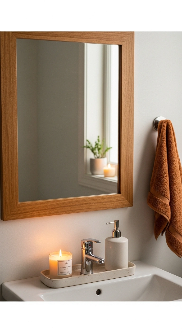 The area around your mirror is a great place to add cozy fall touches. Start by framing your mirror with warm-toned accents like a wooden or gold border. Add small decor items on the counter below, such as a candle or a small plant. You can also hang a soft hand towel nearby in a fall color to tie everything together. Consider adding a small wall sconce with warm lighting for extra ambiance. Keep the look clean and simple so it doesn’t feel cluttered. This small upgrade can make your bathroom feel more polished and seasonally styled.