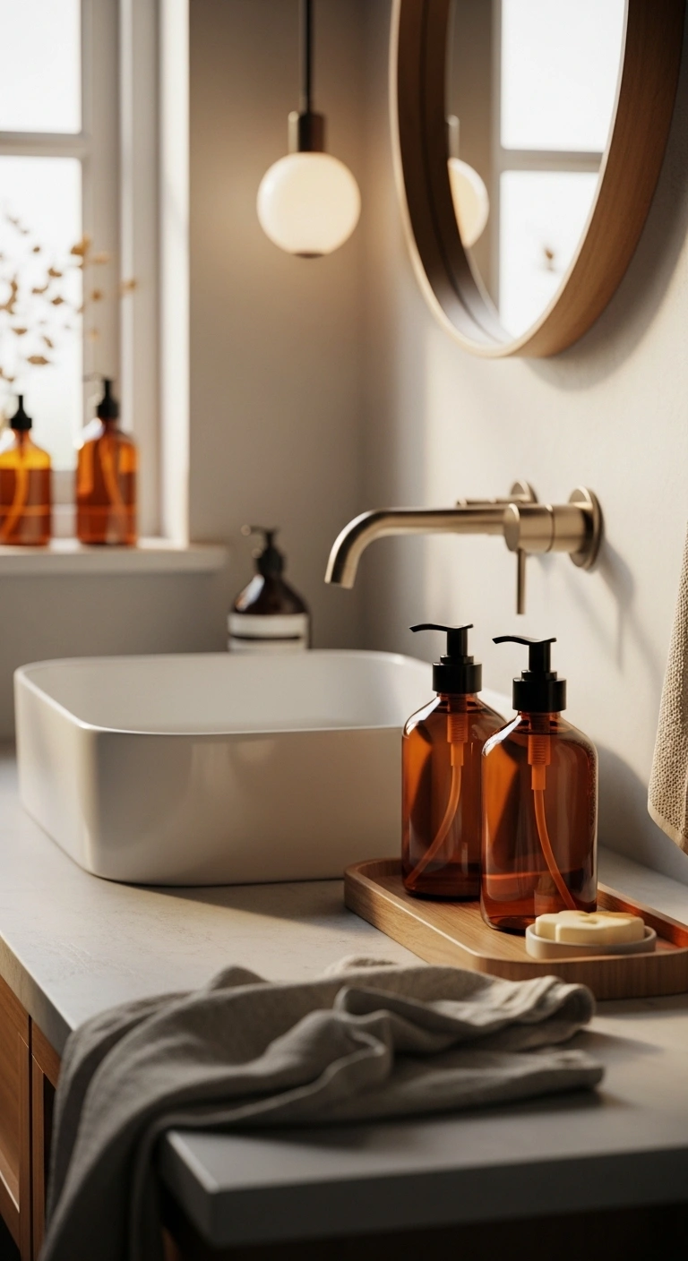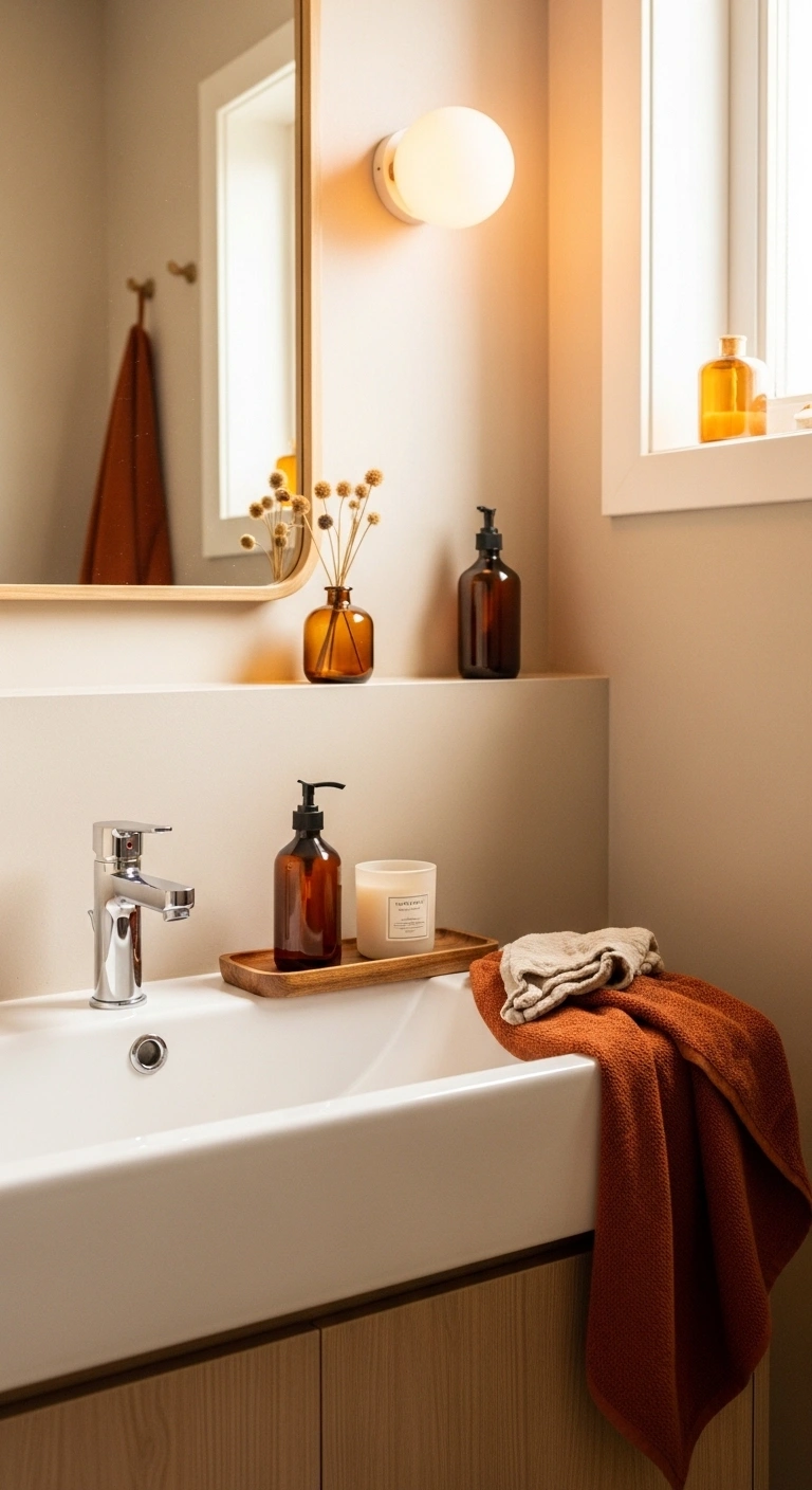 Amber glass is a perfect material for creating cozy autumn vibes in your bathroom. Use amber bottles for soap, lotion, or even as small vases. The warm tint softens light and adds a golden glow to your space. Pair these pieces with wooden trays or neutral countertops for a balanced look. You can also place them near a light source to enhance the warm effect. This idea feels simple but makes a big visual difference. It works especially well in bathrooms with white or light-colored surfaces because it adds contrast without feeling harsh. Keep the styling minimal for a clean and modern feel.