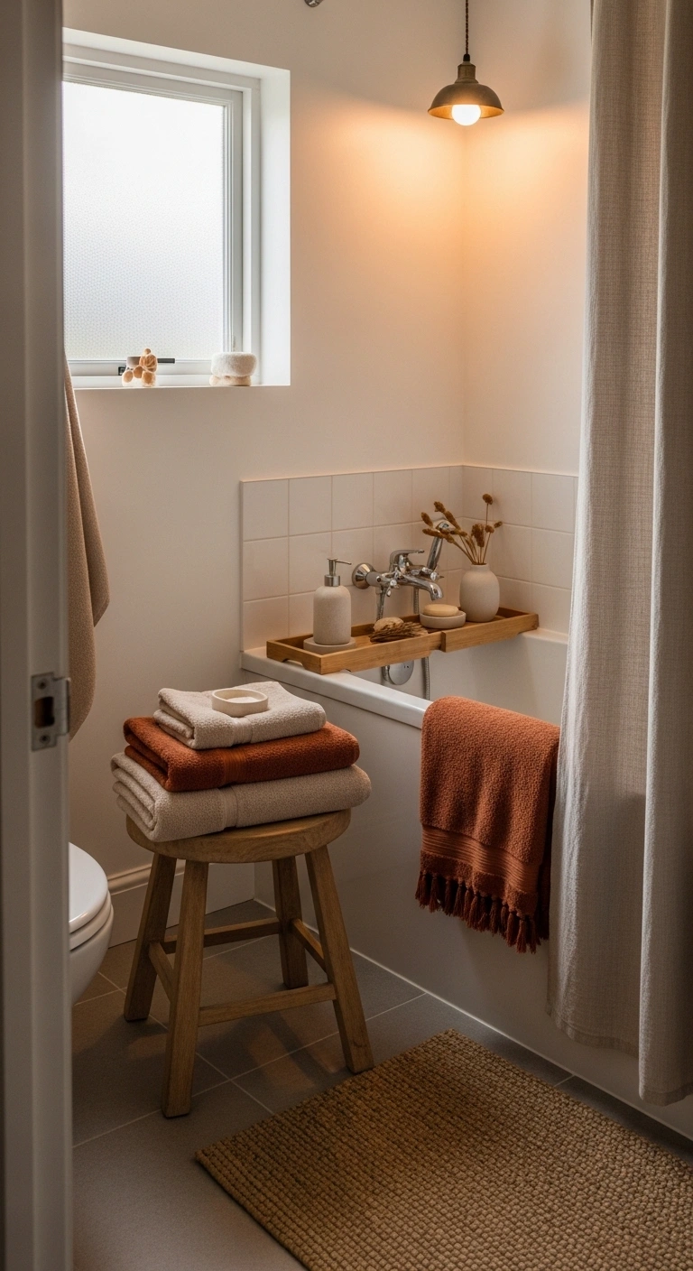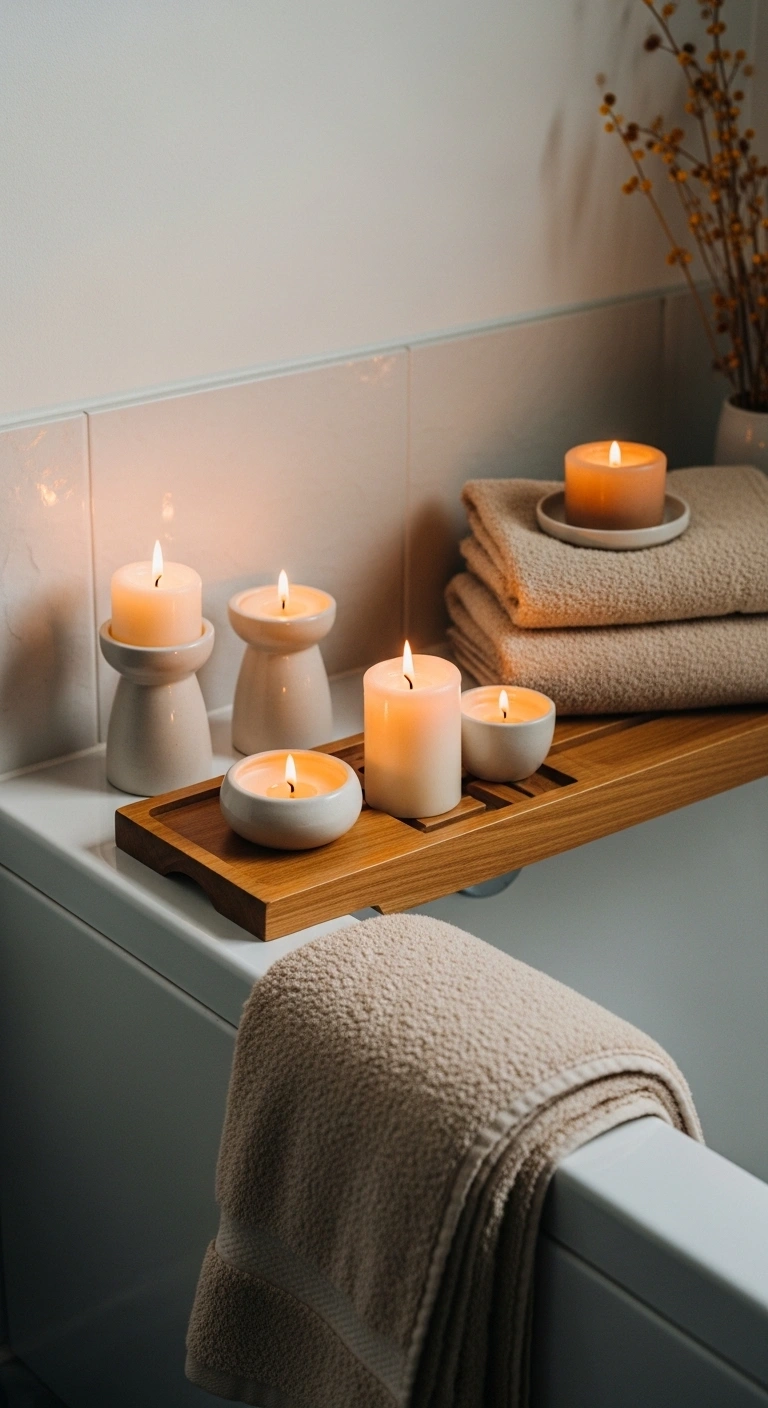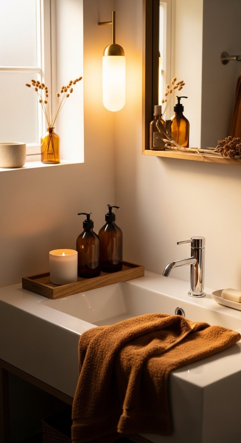 Lighting plays a huge role in creating cozy fall vibes in your bathroom. Swap harsh white lights for warmer bulbs that give off a soft, golden glow. You can also place a small lamp on the counter or shelf to create a gentle light layer. Candles are another great option for adding warmth and calm energy. Choose scents like vanilla, cinnamon, or amber to match the fall theme. Place candles in glass or ceramic holders for a clean look. Try grouping two or three lights together at different heights to create a cozy atmosphere. This layered lighting makes your bathroom feel more like a relaxing retreat instead of just a functional space.