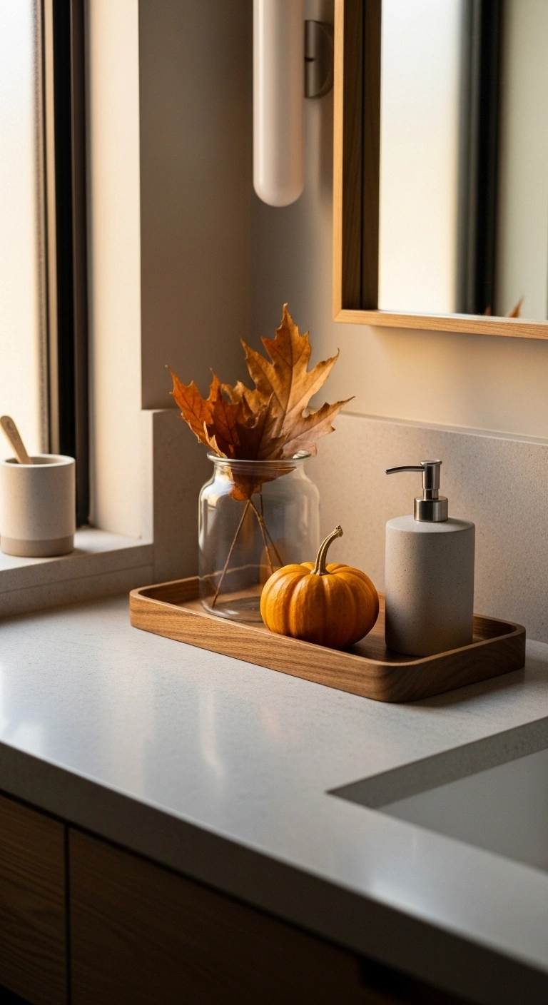 Bring the outside in by decorating your bathroom counter with natural fall pieces. A small wooden tray can hold items like dried leaves, mini pumpkins, or pinecones for an easy seasonal touch. Choose soft, faded colors instead of bright ones to keep the look calm and elegant. You can also place a small glass jar filled with acorns or dried orange slices for added detail. Keep everything minimal so your space still feels clean and functional. Mixing natural textures like wood, glass, and stone creates depth without clutter. This idea works especially well in small bathrooms because it adds warmth without taking up much space. Aim for a simple, curated look that feels thoughtful rather than overdone.