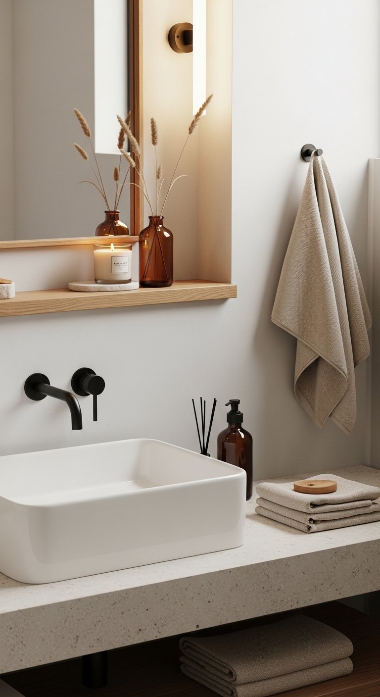 Creating contrast between matte and glossy surfaces can make your bathroom feel more dynamic for fall. Pair matte ceramic accessories with glossy tiles or shiny faucets. For example, use a matte soap dispenser in a warm tone alongside a polished sink or mirror. This mix adds subtle interest without needing bold colors. Stick to a consistent color palette like beige, brown, and soft gold to keep everything cohesive. The contrast in finishes reflects light differently, adding warmth and depth to the room. This approach feels modern yet cozy, perfect for a seasonal update that doesn’t rely on heavy decor.