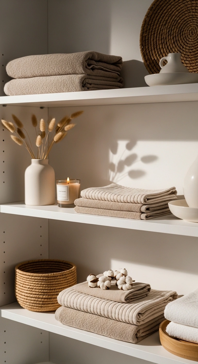 Open shelves give you the perfect space to create a cozy fall display. Start with a base of folded towels or woven baskets, then add small decor pieces on top. Mix textures like wood, ceramic, and soft fabrics to create depth. You can include items like candles, small vases, or dried flowers in warm autumn shades. Keep the arrangement balanced by grouping items in odd numbers and varying their heights. Avoid overcrowding the shelves so everything feels intentional. This layered look makes your bathroom feel styled and inviting while still being practical.