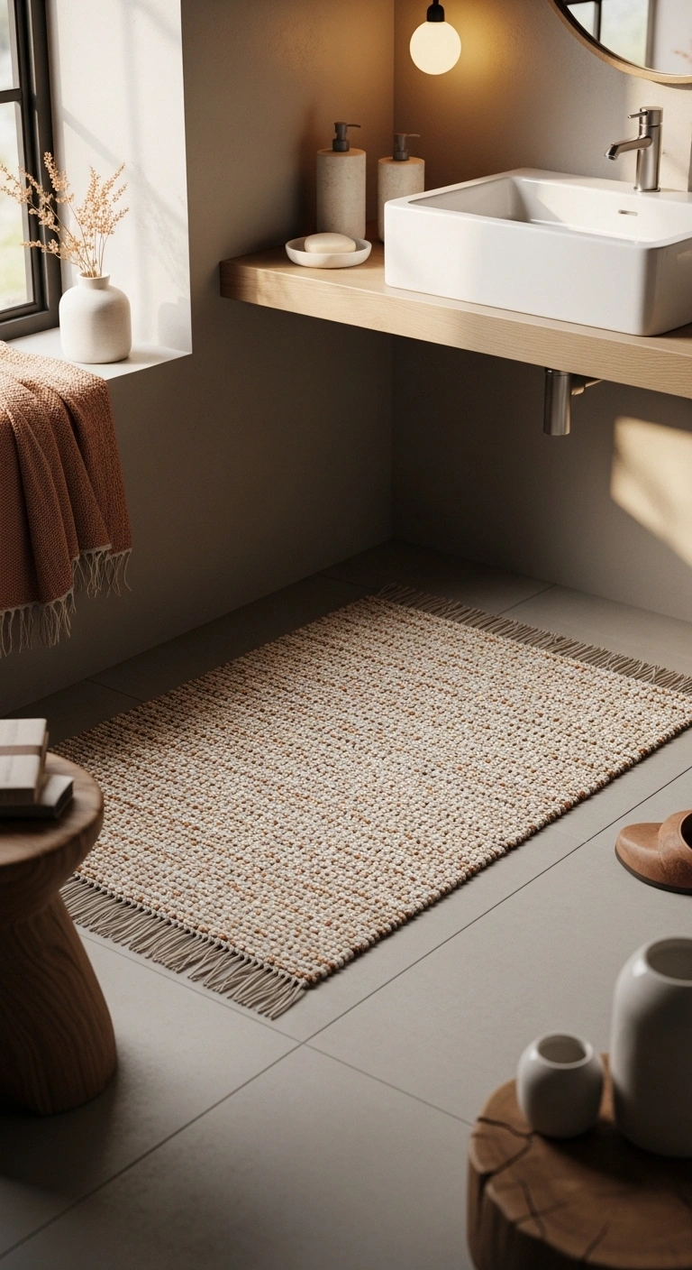 A soft rug can completely change how your bathroom feels underfoot during fall. Choose a rug with a plush or woven texture in warm tones like deep beige, rust, or dusty rose. Look for patterns that feel subtle, such as faded vintage designs or simple stripes. Place it near the sink or bathtub where you step most often. This not only adds comfort but also brings warmth into the space visually. Make sure the rug is easy to clean and suitable for bathroom use. A well-chosen rug can tie all your fall elements together while making the space feel more inviting and lived-in.