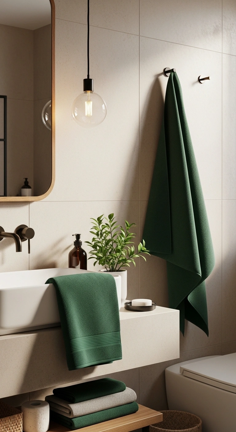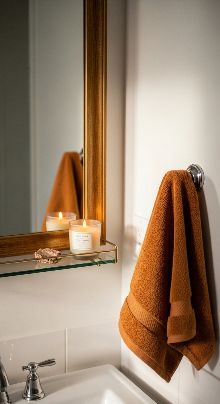 Instead of storing all your towels away, display a few in warm fall shades to add color and softness. Choose tones like cinnamon, clay, or muted mustard for a seasonal feel. Hang them neatly on hooks or towel bars where they are easy to see. This creates a layered look that feels both functional and decorative. Mix one or two colors with neutral towels to avoid overwhelming the space. The key is to keep the arrangement simple and intentional. This small change adds warmth and makes your bathroom feel more styled without extra effort.